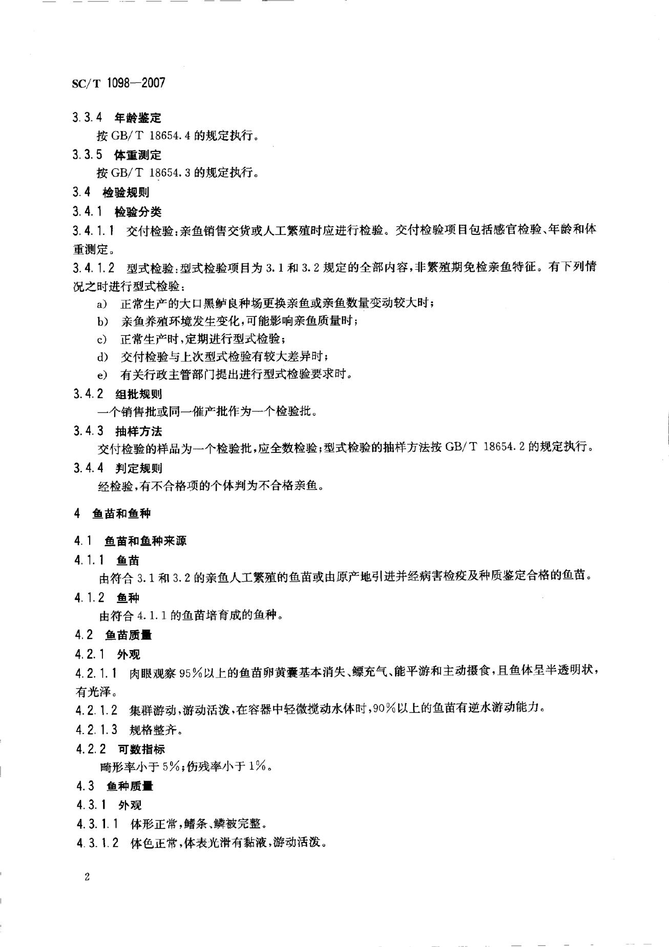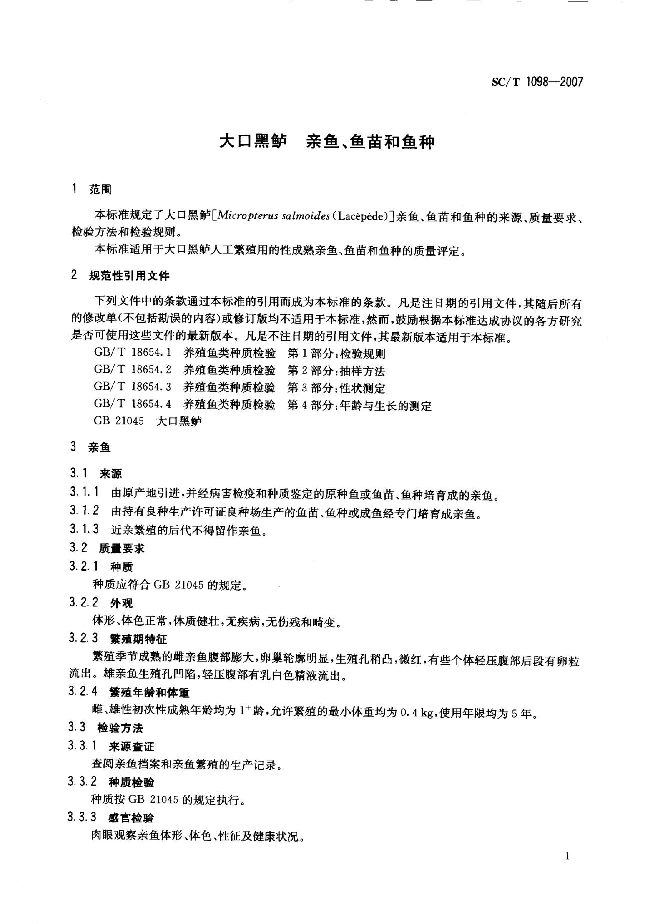 SC/T 1098-2007 大口黑鲈 亲鱼、鱼苗和鱼种