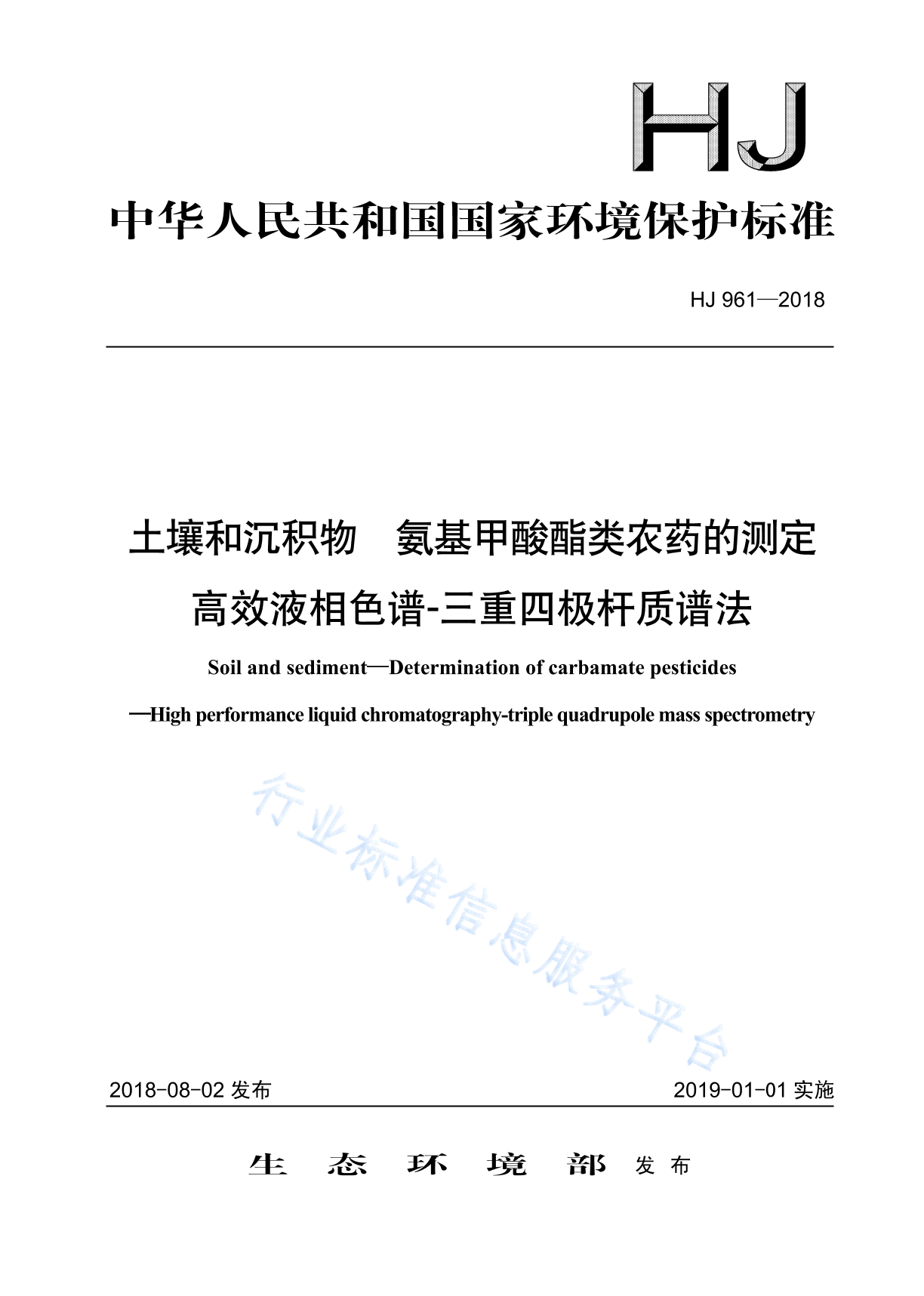 HJ 961-2018 土壤和沉积物 氨基甲酸酯类农药的测定 高效液相色谱-三重四极杆质谱法