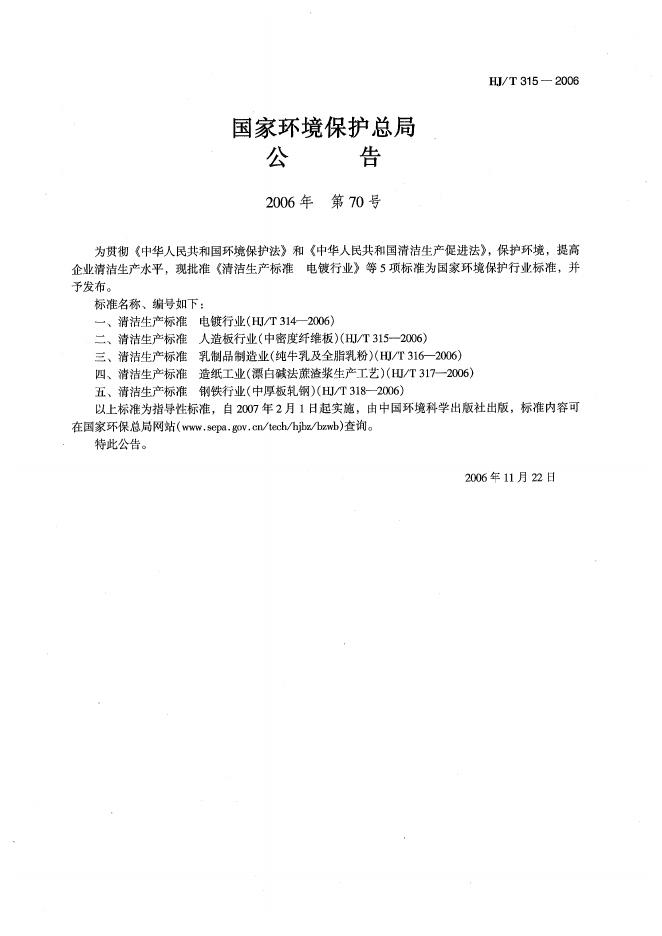 HJ/T 315-2006 清洁生产标准 人造板行业(中密度纤维板)