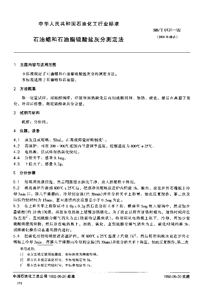SH/T 0131-1992 石油蜡和石油脂硫酸盐灰分测定法