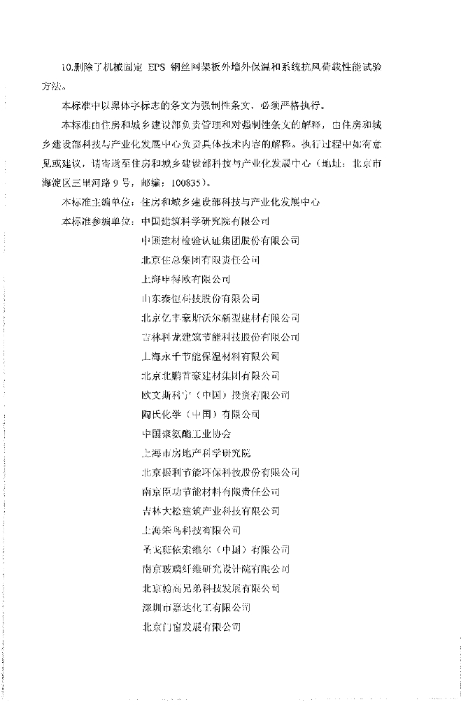 住房和城乡建设部科技与产业化发展中心、中国建筑科学研究院有限公司、中国建材检验认证集团股份有限公司、北京住总集团有限责任公司、上海申得欧有限公司、山东秦恒科技股份有限公司、北京亿丰豪斯沃尔新型建材有限公司、吉林科龙建筑节能科技股份有限公司、上海永千节能保温材料有限公司、北京北鹏首豪建材集团有限公司、欧文斯科宁(中国)投资有限公司、陶氏化学(中国)有限公司、中国聚氨酯工业协会、上海市房地产科学研究院、北京振利节能环保科技股份有限公司、南京臣功节能材料有限责任公司、吉林大松建筑产业科技有限公司、上海笨鸟科技有