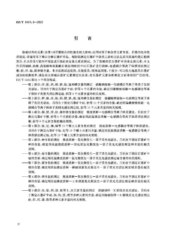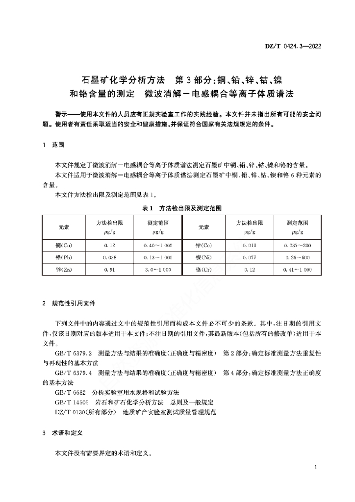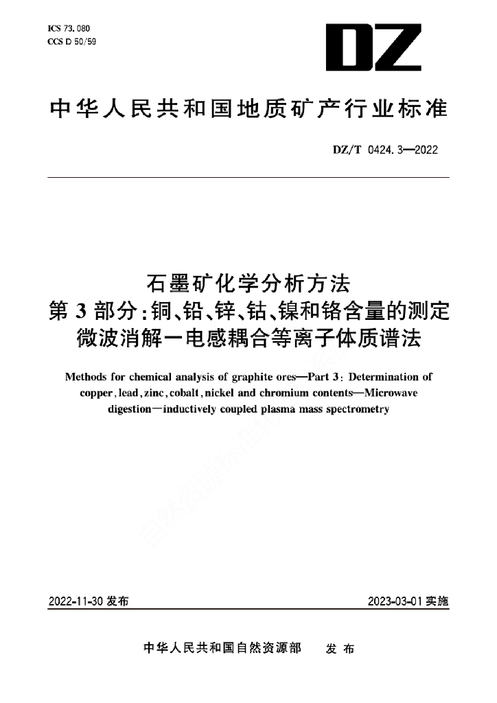DZ/T 0424.3-2022 石墨矿化学分析方法 第3部分:铜、铅、锌、钴、镍和铬含量的测定 微波消解-电感耦合等离子体质谱法