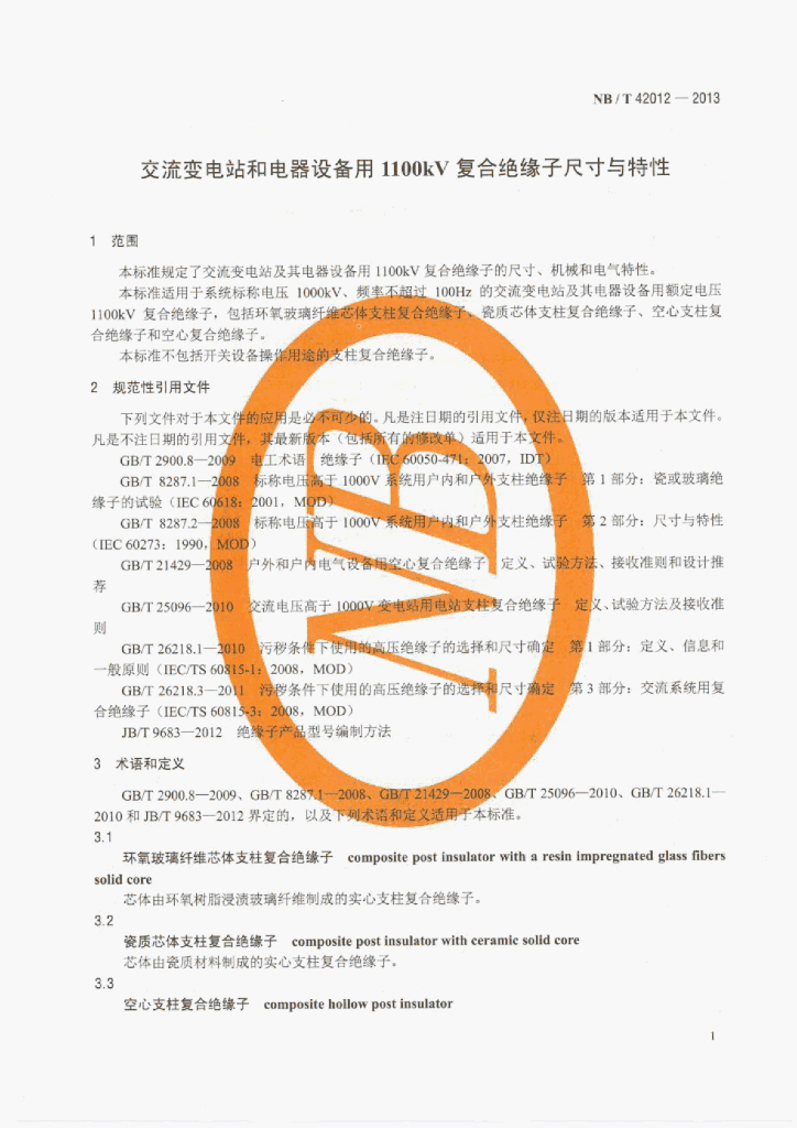 NB/T 42012-2013 交流变电站和电器设备用1100kV复合绝缘子尺寸与特性