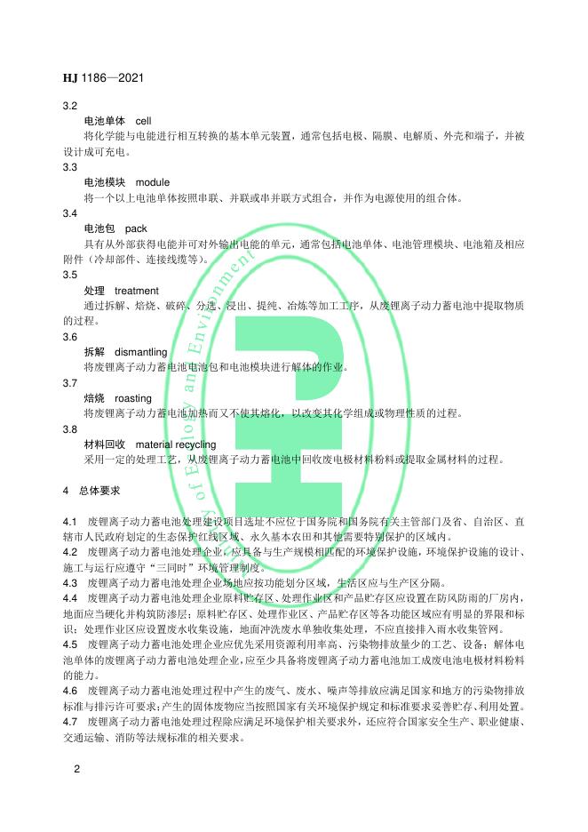HJ 1186-2021 废锂离子动力蓄电池处理污染控制技术规范(试行)