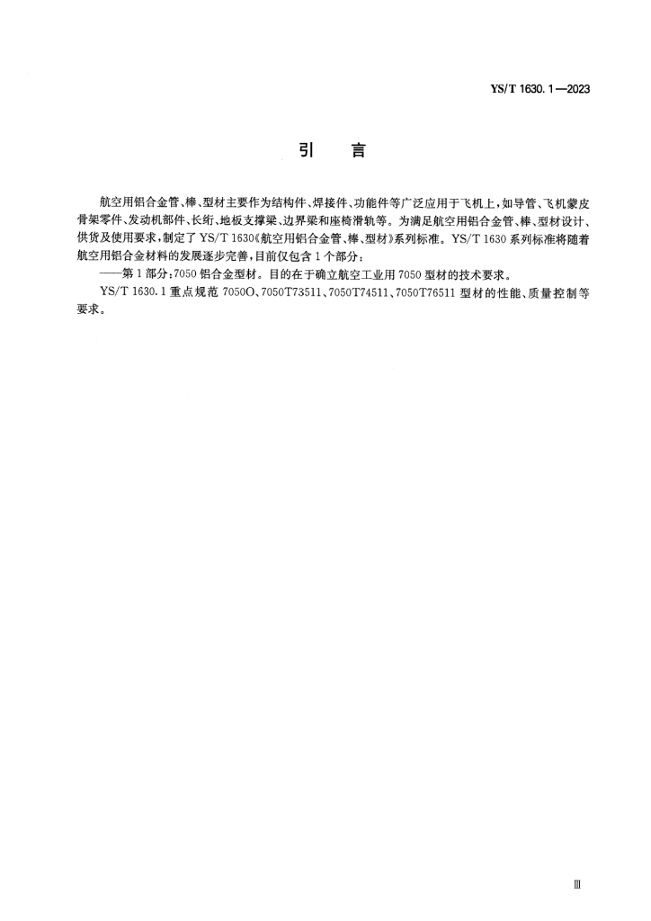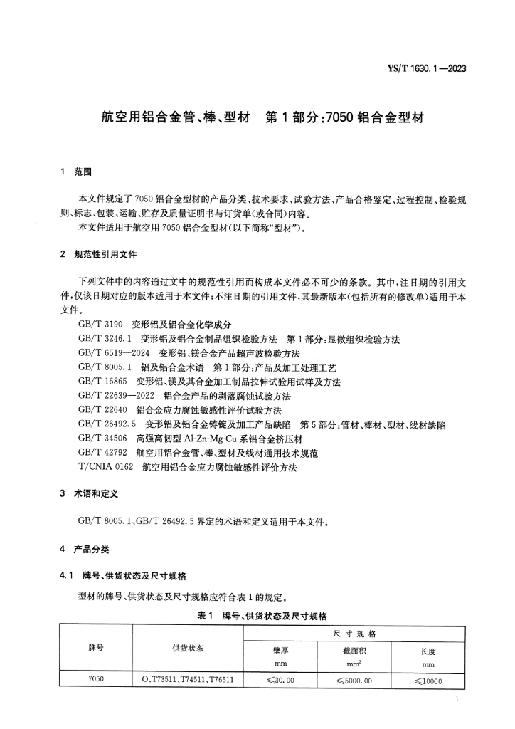 YS/T 1630.1-2023 航空用铝合金管、棒、型材 第1部分:7050铝合金型材