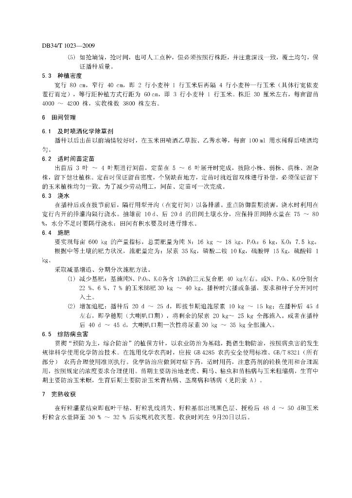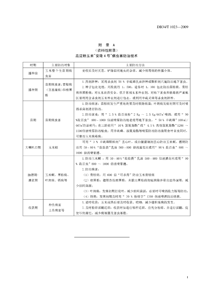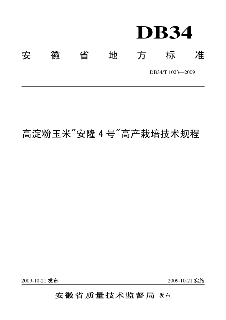 DB34/T 1023-2009 高淀粉玉米“安隆4号”高产栽培技术规程