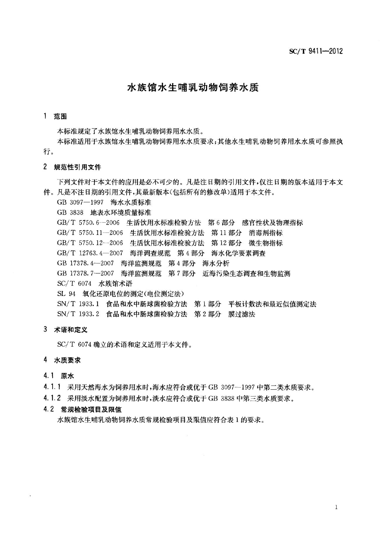 SC/T 9411-2012 水族馆水生哺乳动物饲养水质
