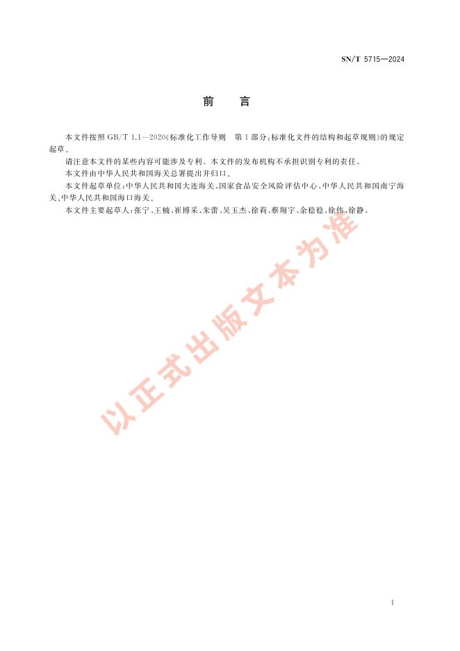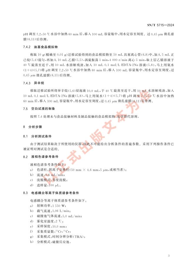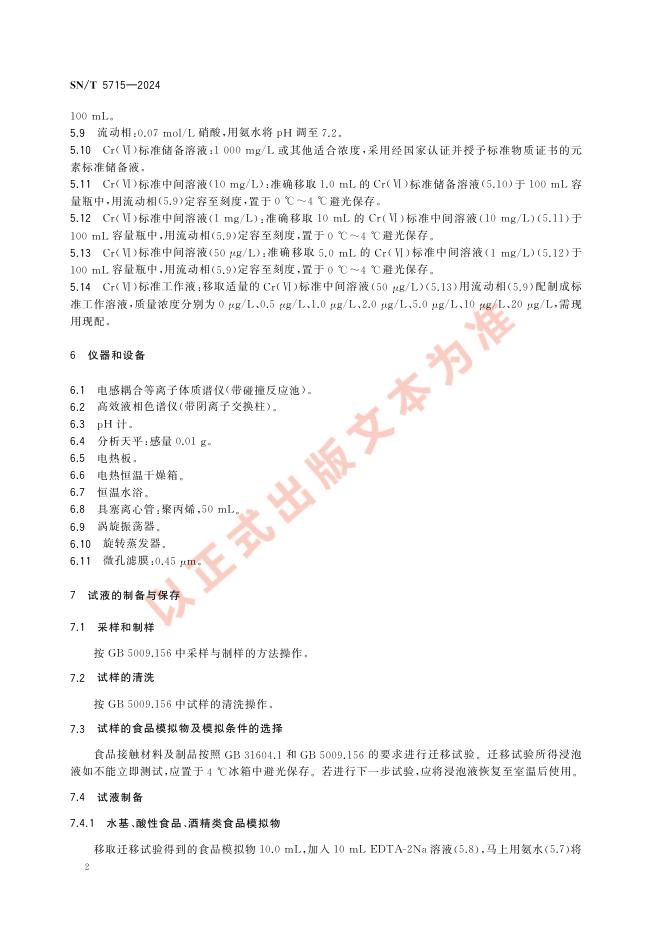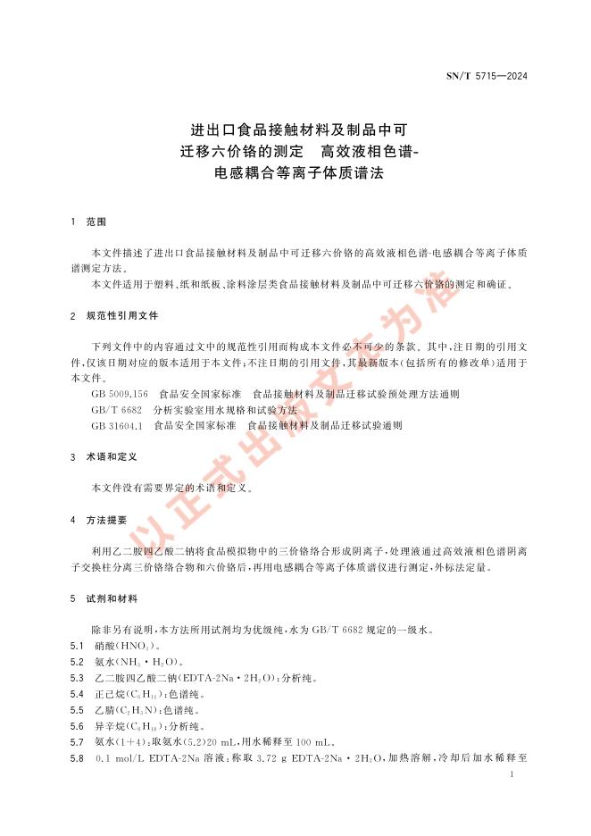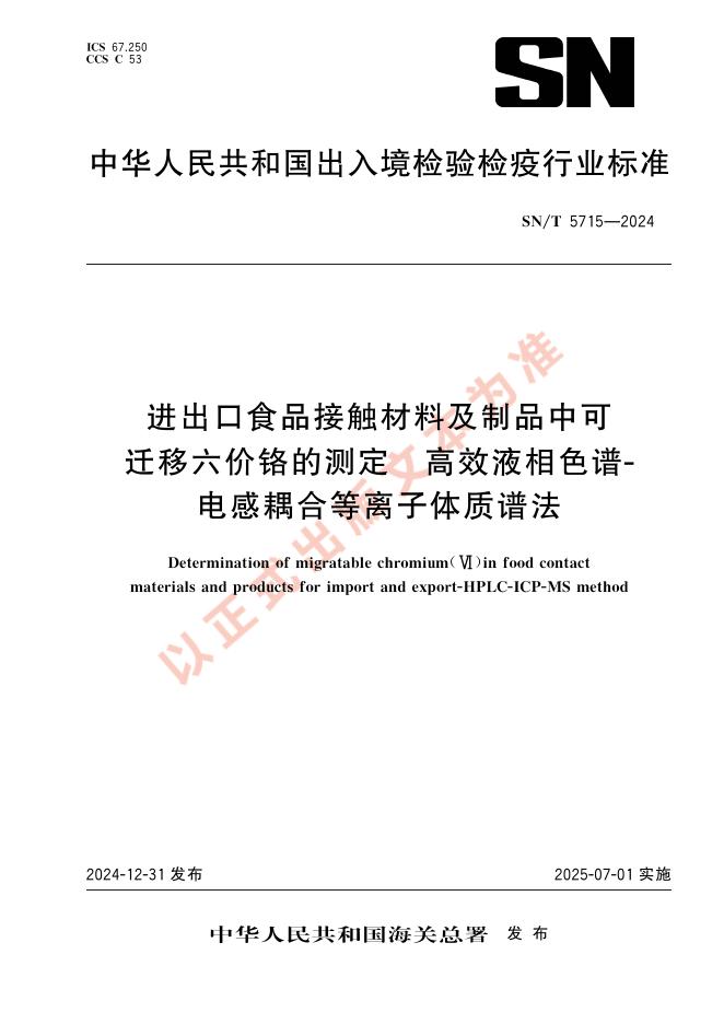 SN/T 5715-2024 进出口食品接触材料及制品中可迁移六价铬的测定 高效液相色谱-电感耦合等离子体质谱法