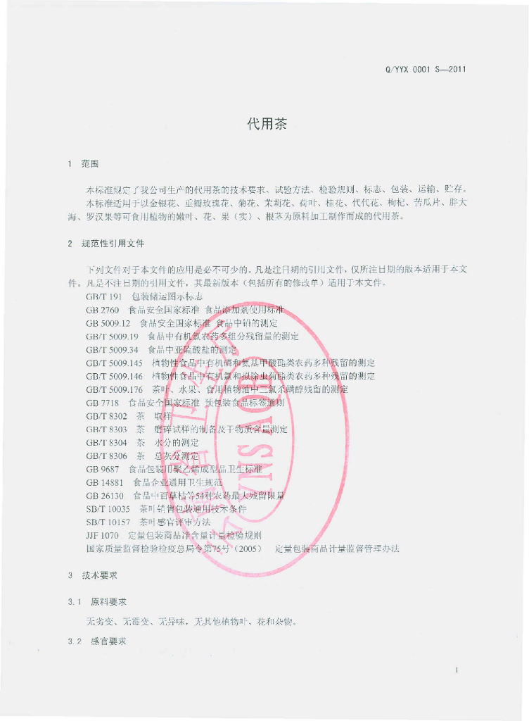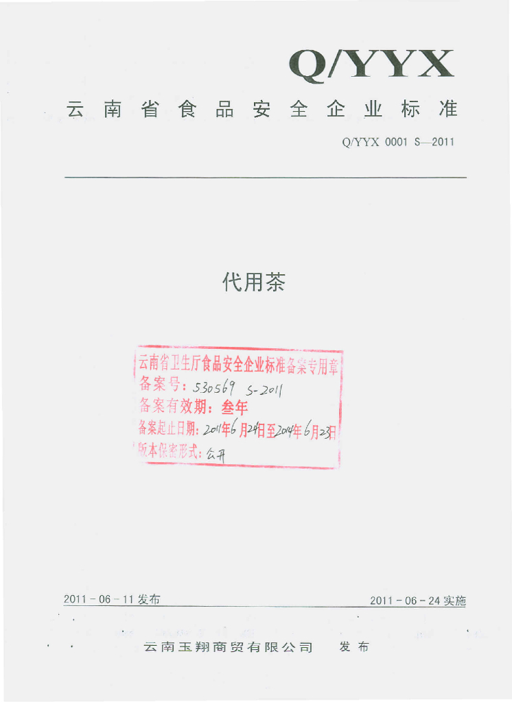 Q/YYX 0001S-2011 代用茶