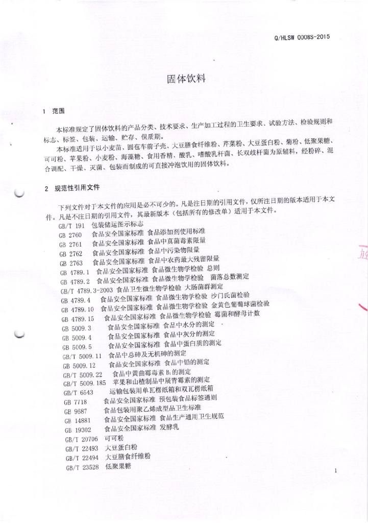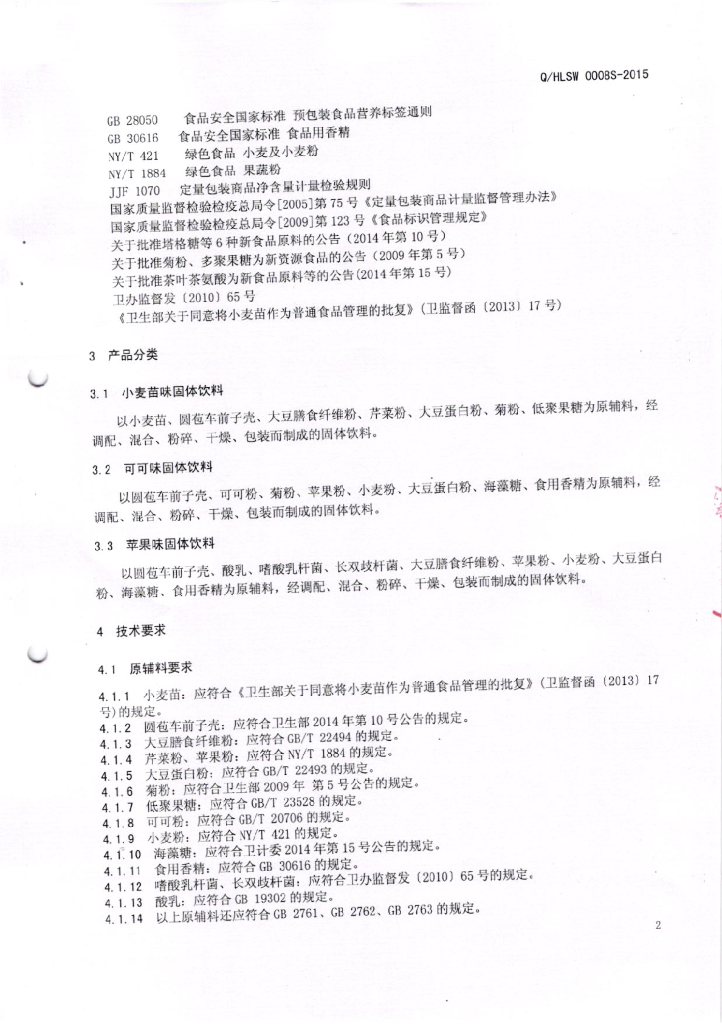 Q/HLSW 0008S-2015 活力生物科技(深圳)有限公司 固体饮料