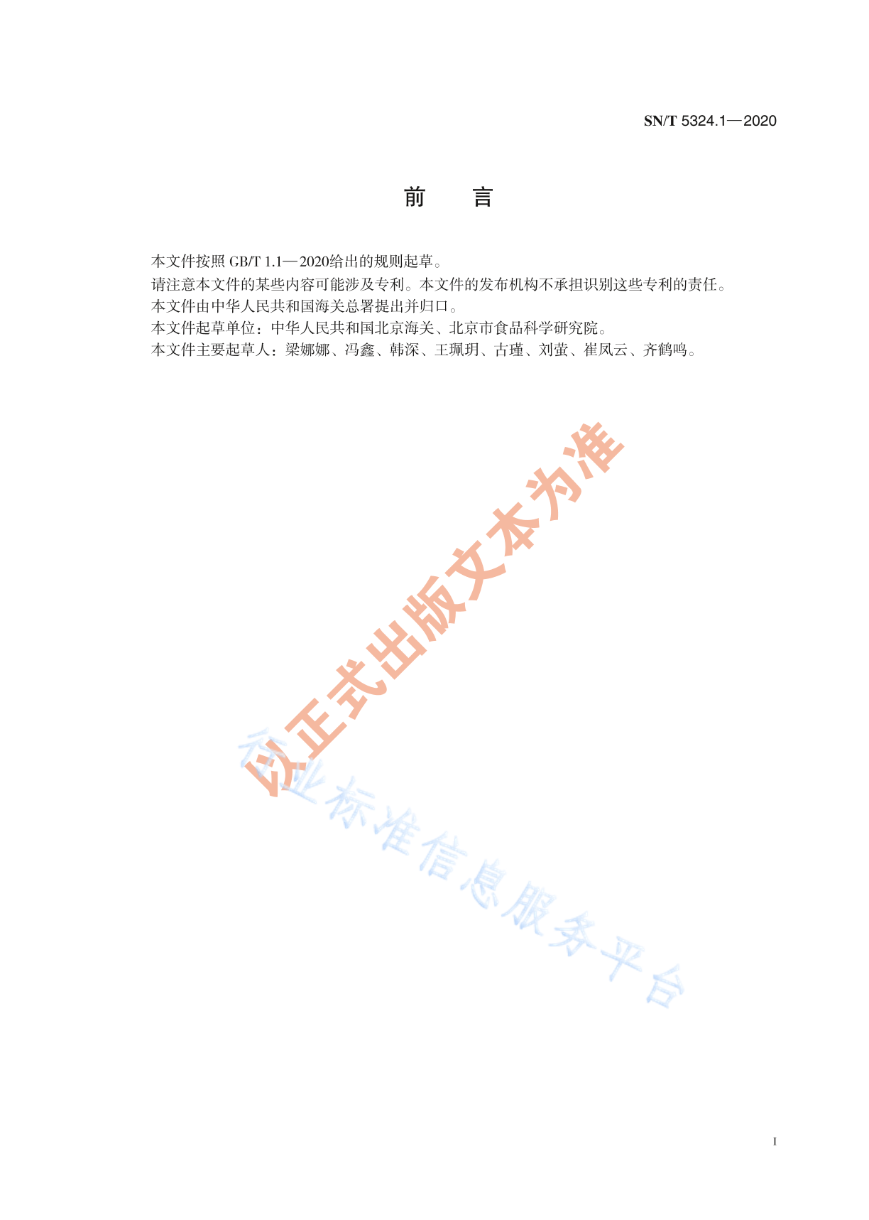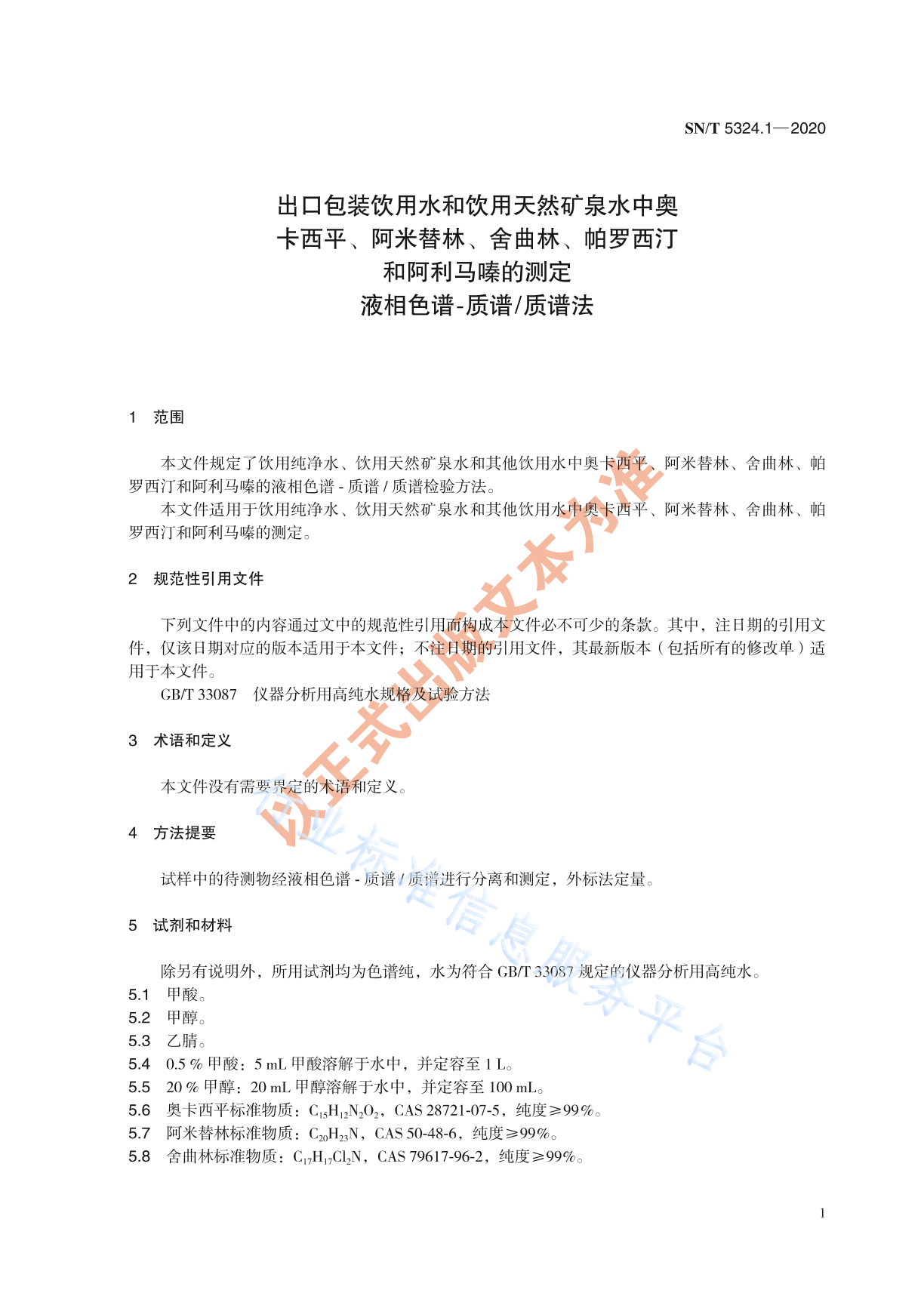 SN/T 5324.1-2020 出口包装饮用水和饮用天然矿泉水中奥卡西平、阿米替林、舍曲林、帕罗西汀和阿利马嗪的测定 液相色谱-质谱质谱法