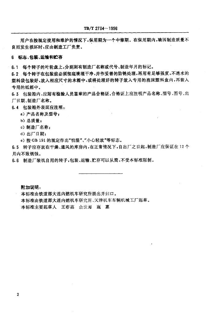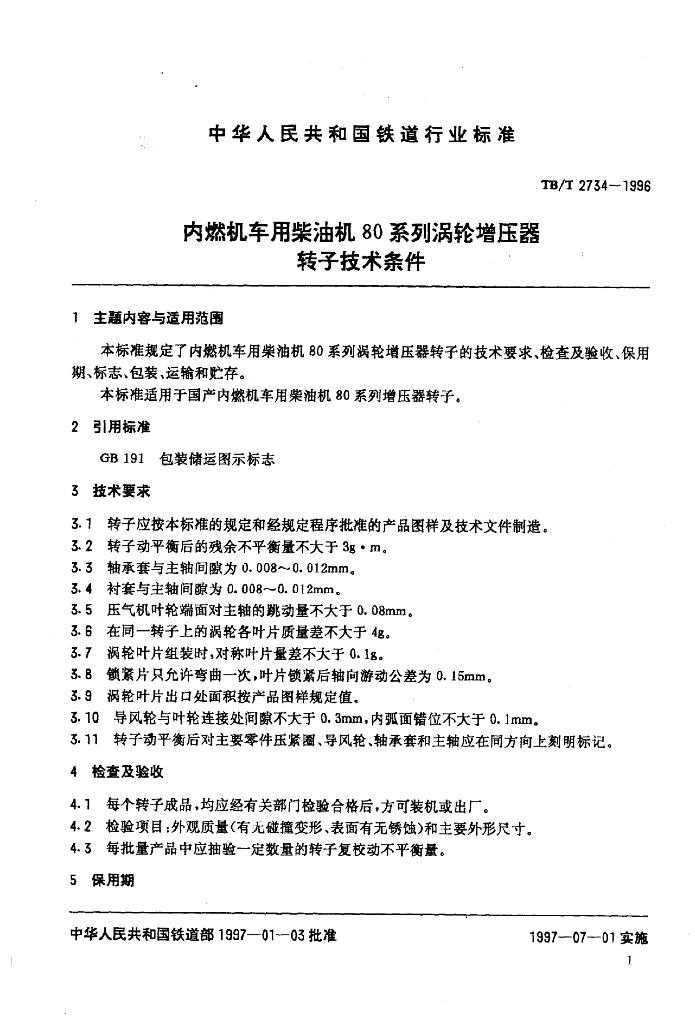 TB/T 2734-1996 内燃机车用柴油机80系列涡轮增压器转子技术条件