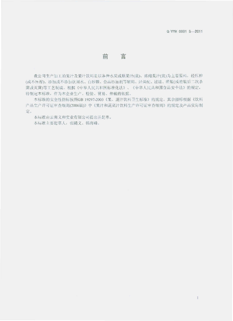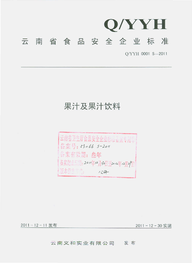Q/YYH 0001S-2011 果汁及果汁饮料