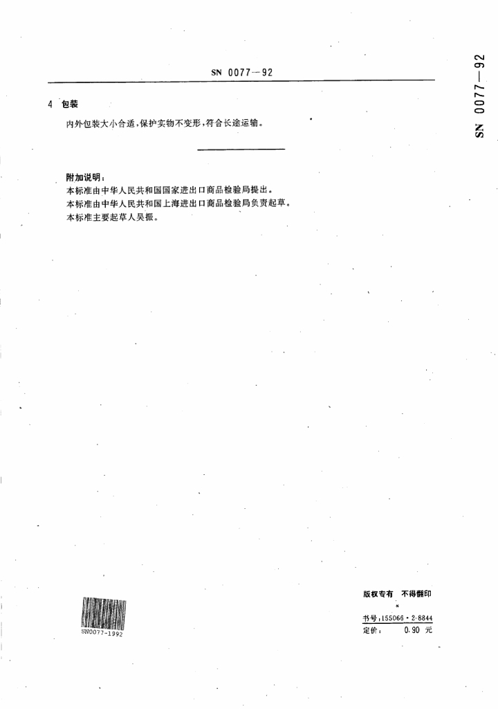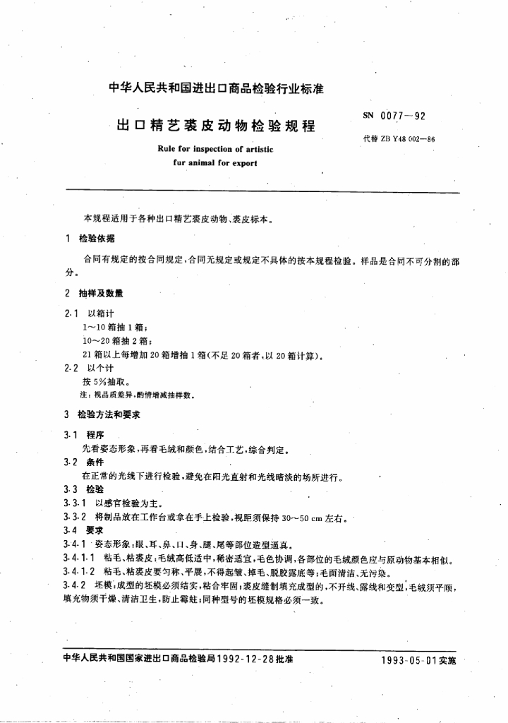 SN 0077-1992 出口精艺裘皮动物检验规程