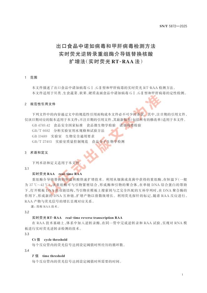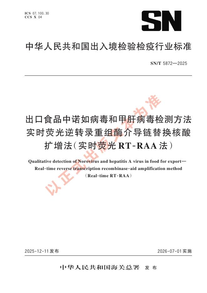 SN/T 5872-2025 出口食品中诺如病毒和甲肝病毒检测方法 实时荧光逆转录重组酶介导链替换核酸扩增法(实时荧光RT-RAA法)