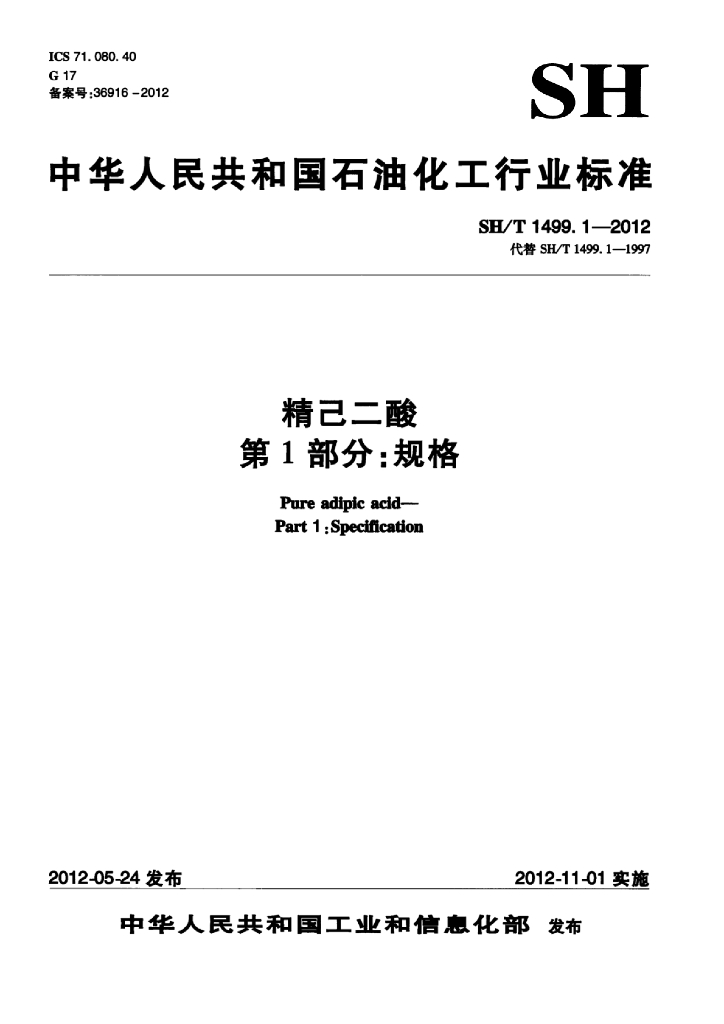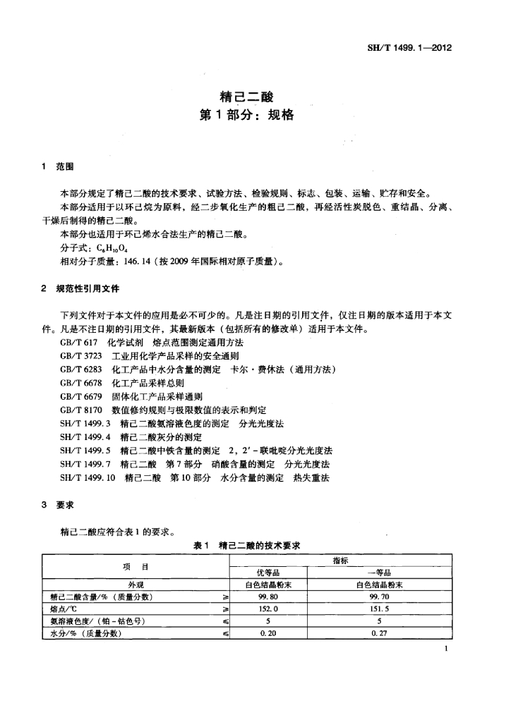 SH/T 1499.1-2012 精己二酸 第1部分:规格