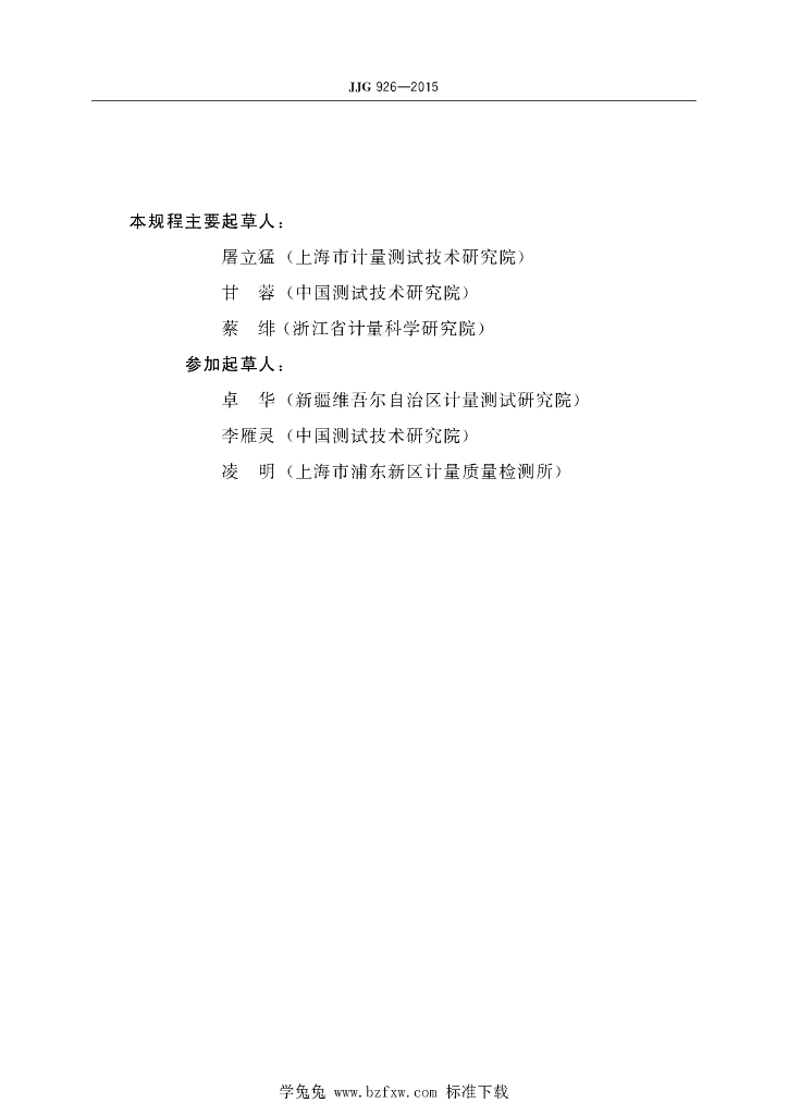 屠立猛(上海市计量测试技术研究院)、甘蓉(中国测试技术研究院)、蔡绊(浙江省计量科学研究院)、卓华(新疆维吾尔自治区计量测试研究院)、李雁灵(中国测试技术研究院)、凌明(上海市浦东新区计量质量检测所)