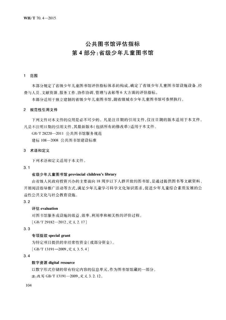 WH/T 70.4-2015 公共图书馆评估指标 第4部分:省级少年儿童图书馆