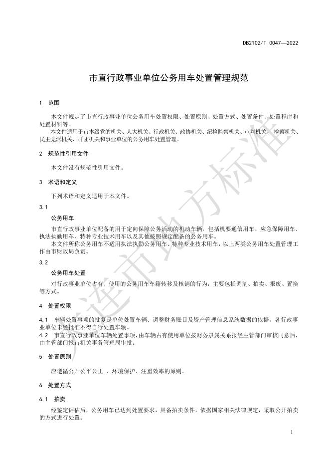 DB2102/T 0047-2022 市直行政事业单位公务用车处置管理规范