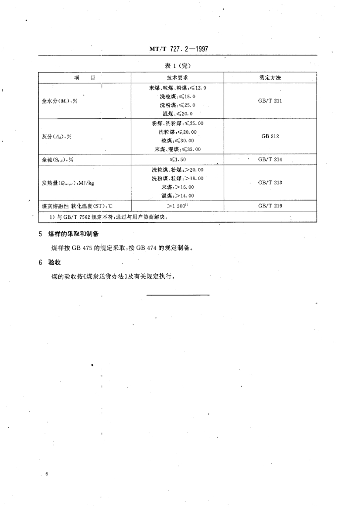 MT/T 727.2-1997 发电煤粉锅炉用阜新矿务局煤技术条件