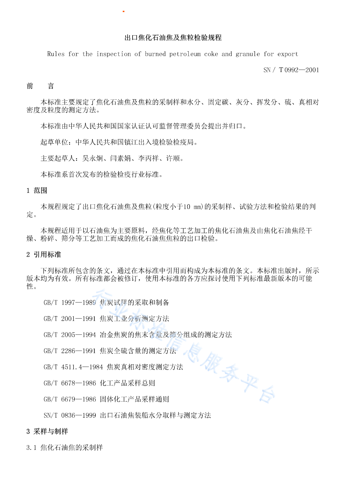 SN/T 0992-2001 出口焦化石油焦及焦粒检验规程