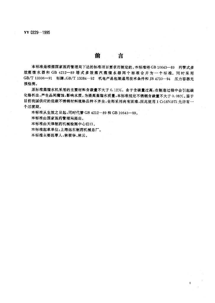 YY 0229-1995 多效蒸馏水机