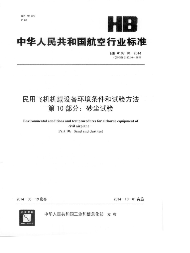 HB 6167.10-2014 民用飞机机载设备环境条件和试验方法 第10部分:砂尘试验