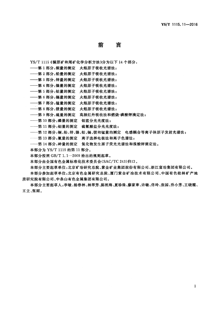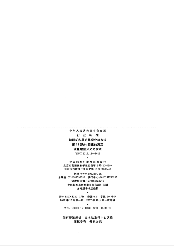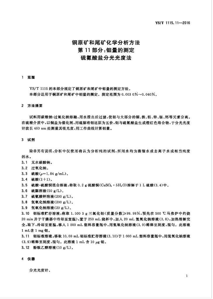 YS/T 1115.11-2016 铜原矿和尾矿化学分析方法 第11部分:钼量的测定 硫氰酸盐分光光度法
