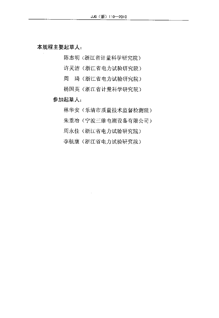陈志明(浙江省计量科学研究院)、许灵洁(浙江省电力试验研究院)、周琦(浙江省电力试验研究院)、杨国英(浙江省计量科学研究院)、林华安(乐清市质量技术监督检测院)、朱重治(宁波三维电测设备有限公司)、周永佳(浙江省电力试验研究院)、李航康(浙江省电力试验研究院)