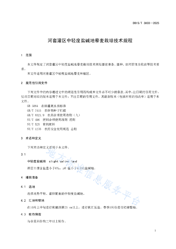 DB15/T 3803-2025 河套灌区中轻度盐碱地藜麦栽培技术规程