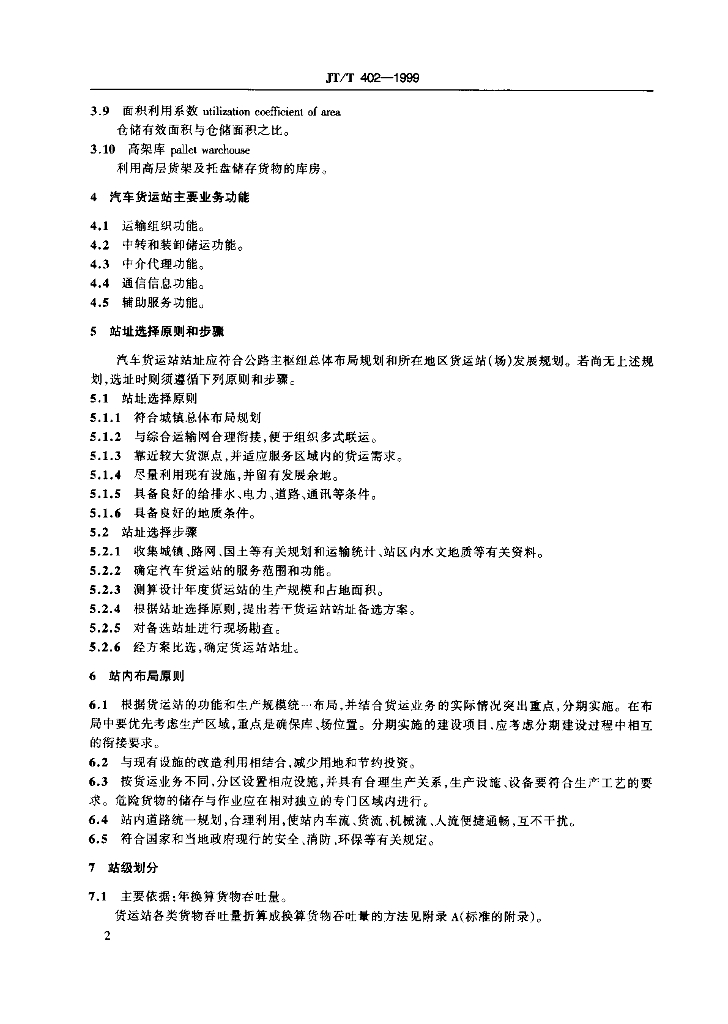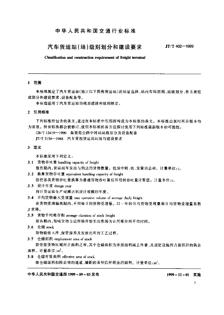 JT/T 402-1999 汽车货运站(场)级别划分和建设要求