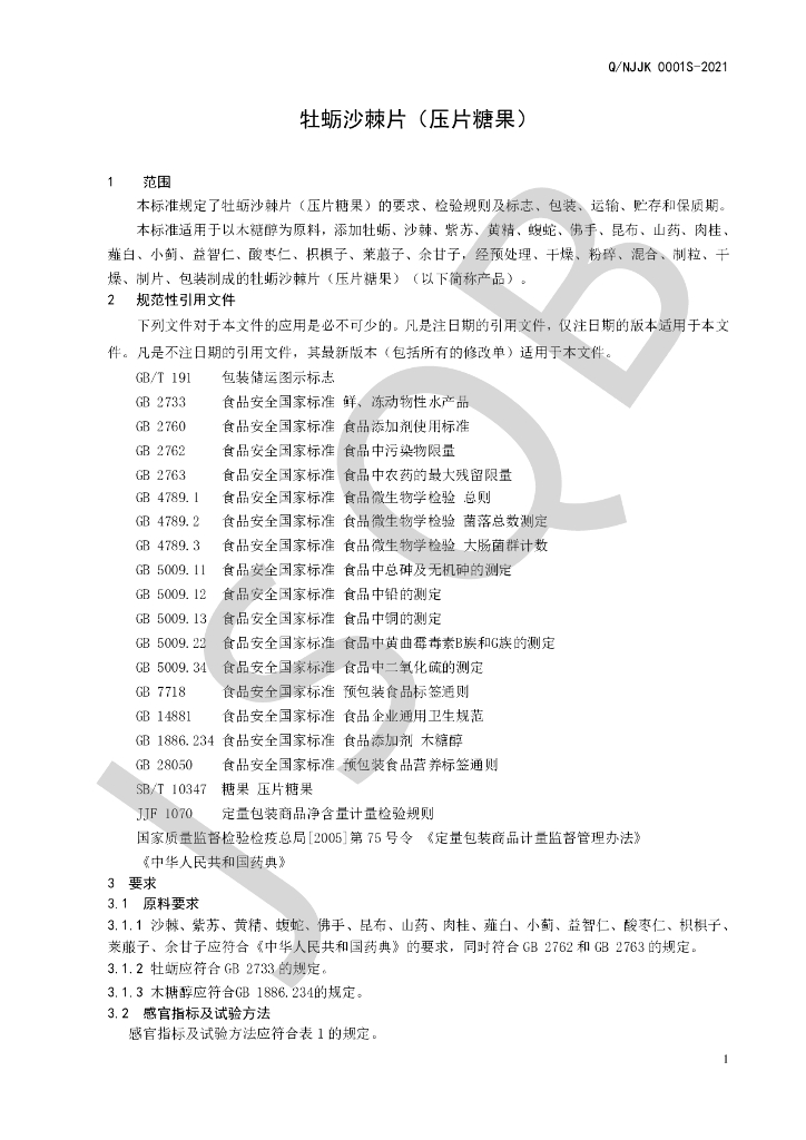 Q/NJJK 0001S-2021 牡蛎沙棘片(压片糖果)