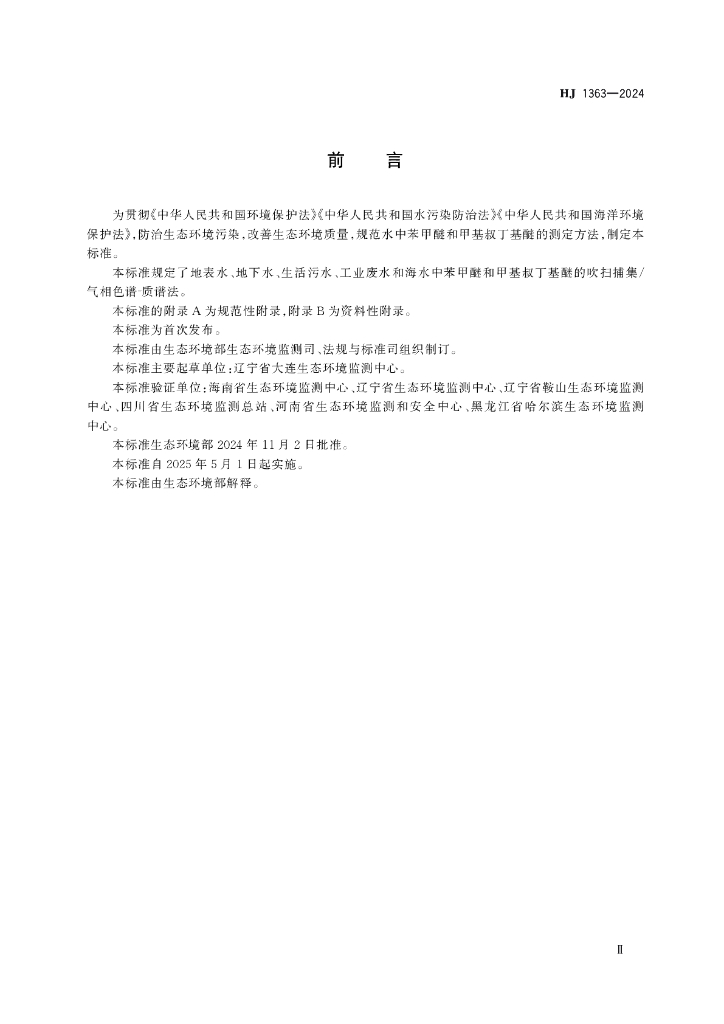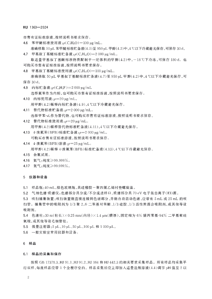 HJ 1363-2024 水质 苯甲醚和甲基叔丁基醚的测定 吹扫捕集/气相色谱-质谱法