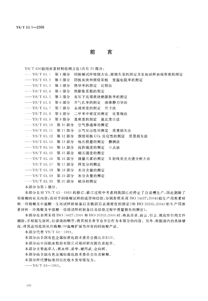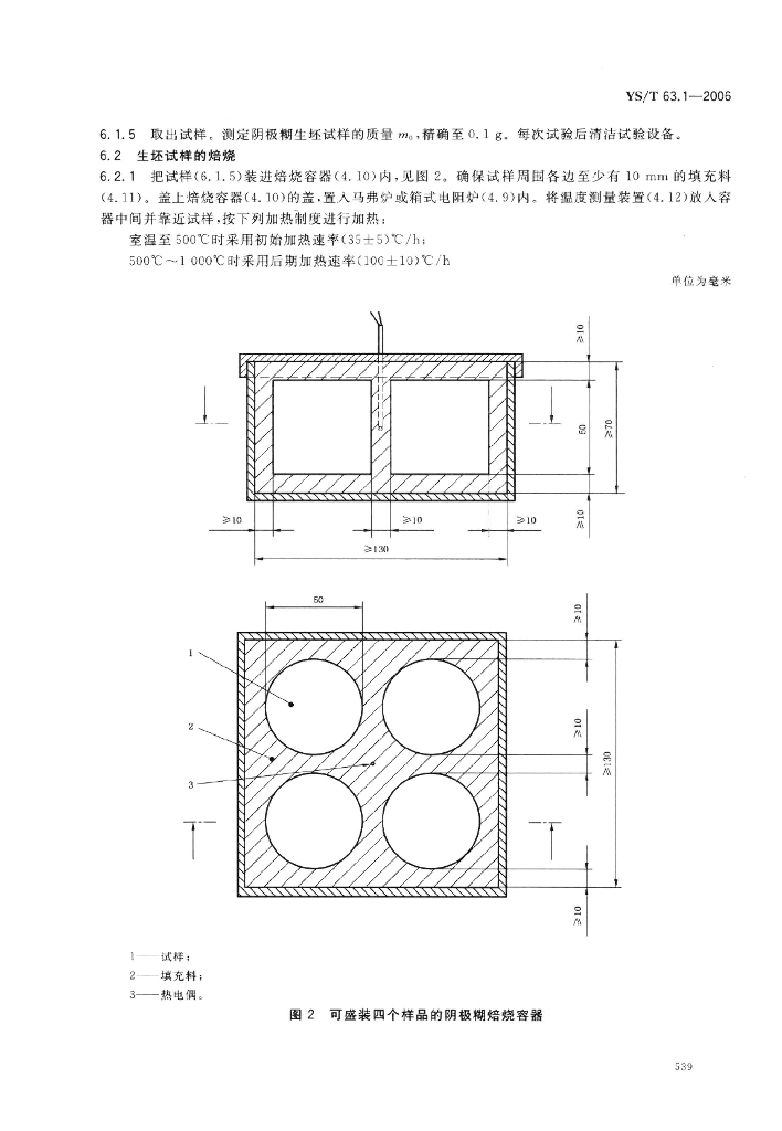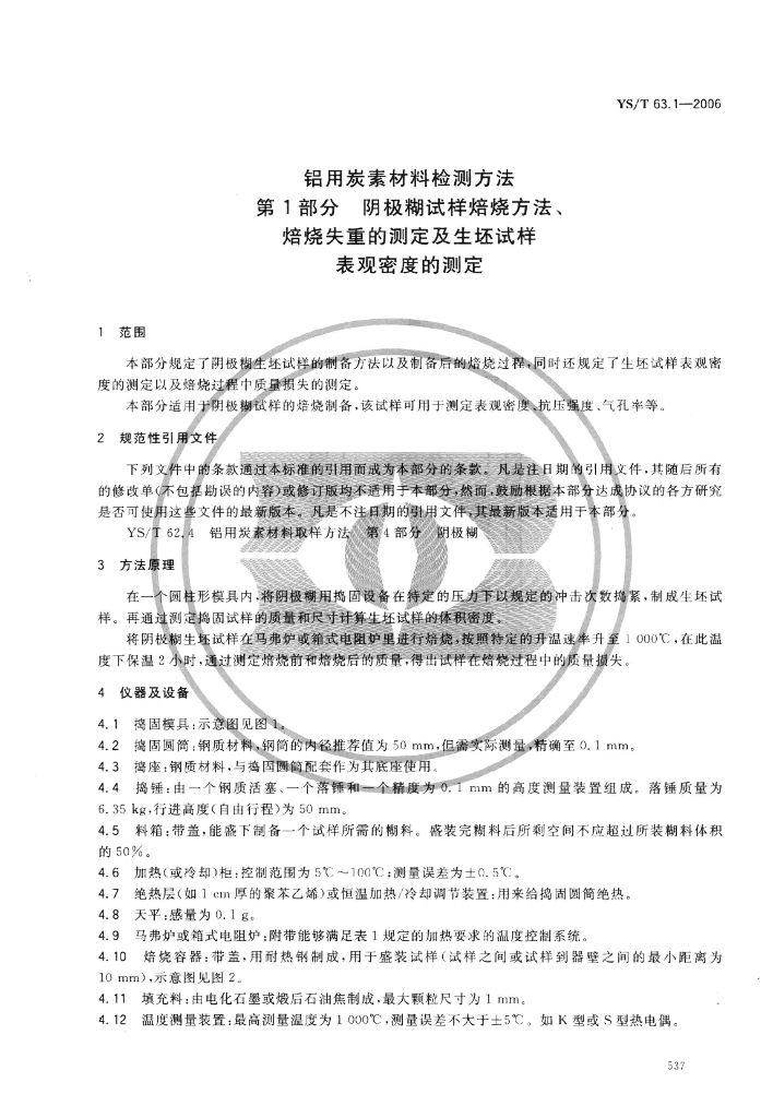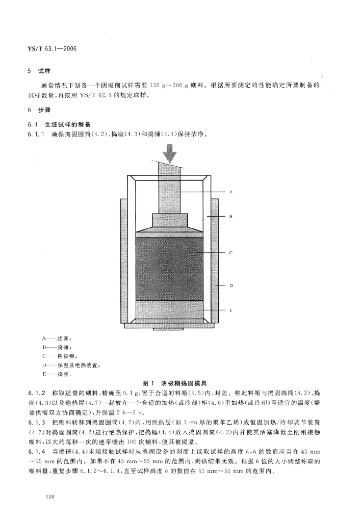 YS/T 63.1-2006 铝用炭素材料检测方法 第1部分:阴极糊试样焙烧方法、焙烧失重的测定及生坯试样表观密度的测定