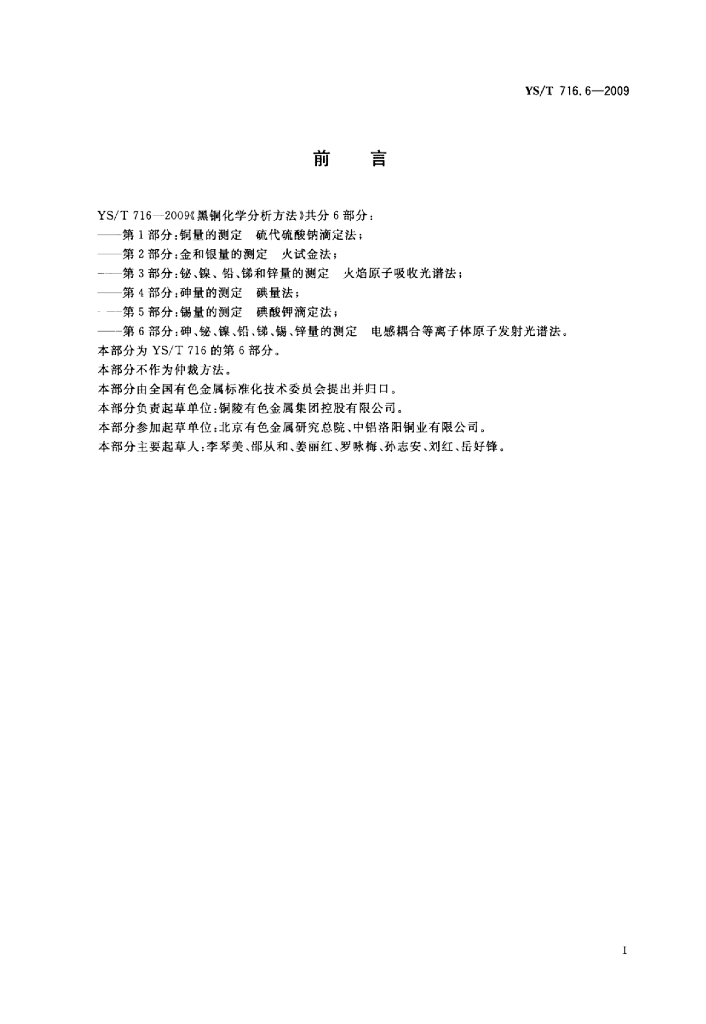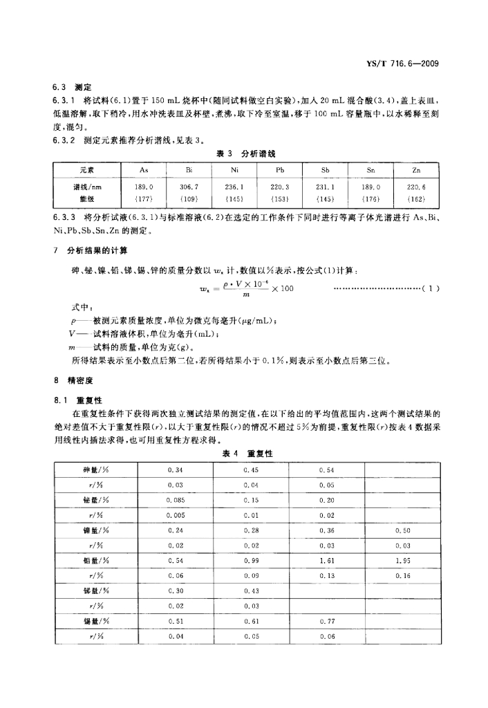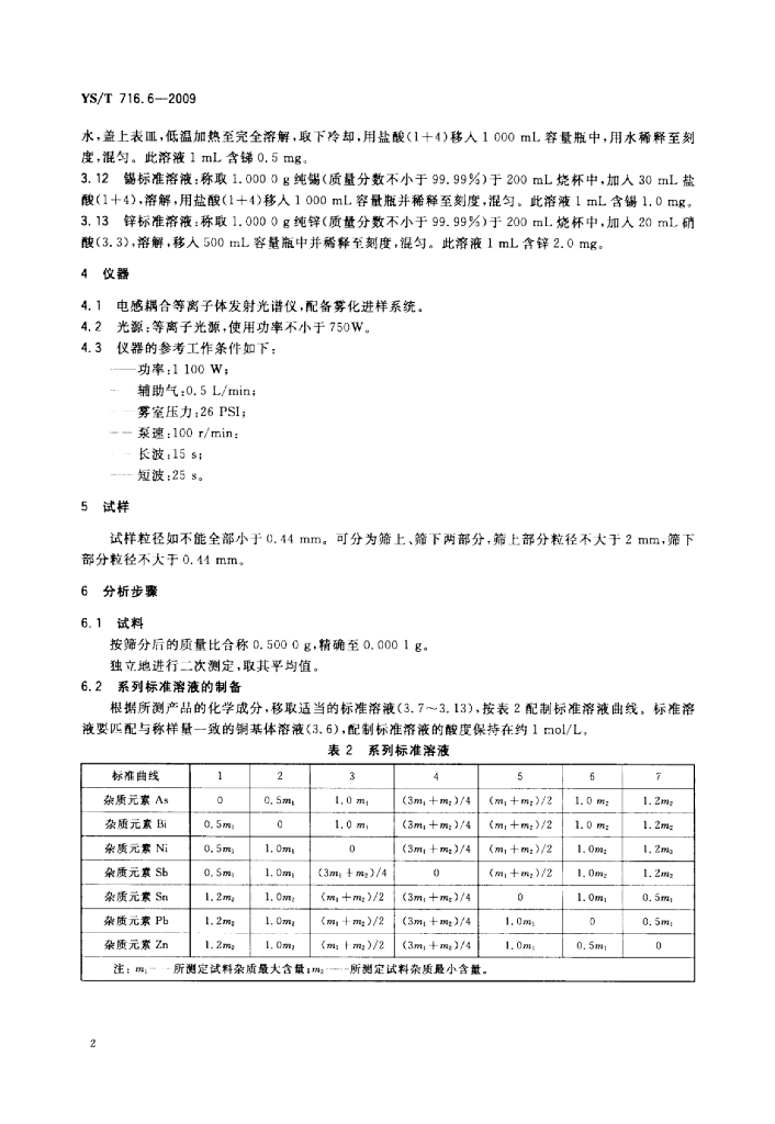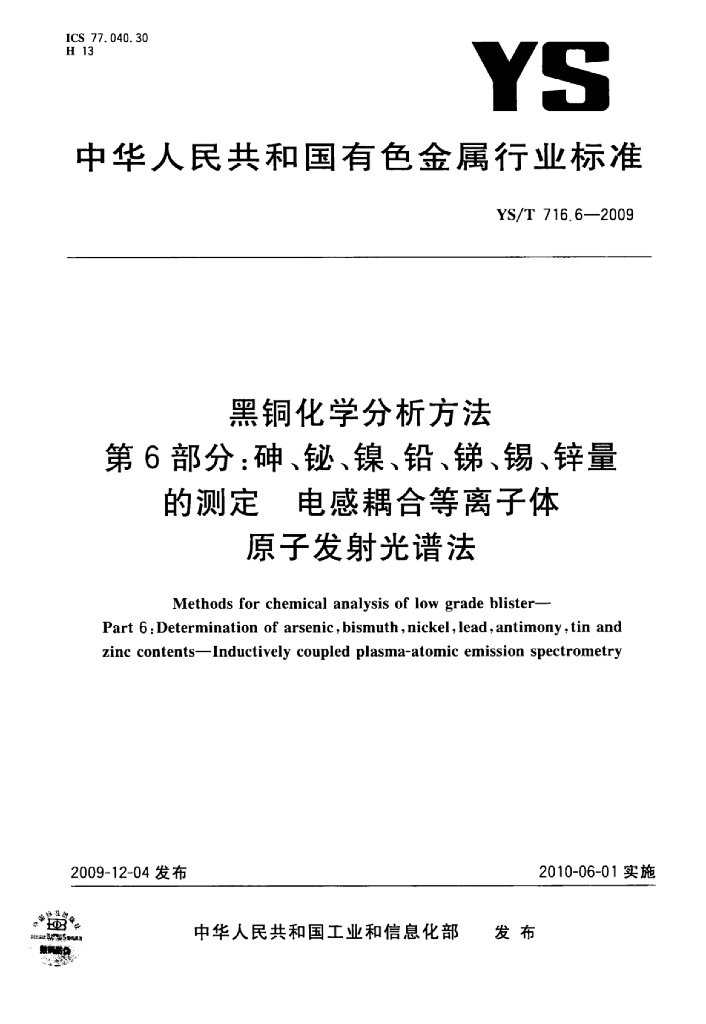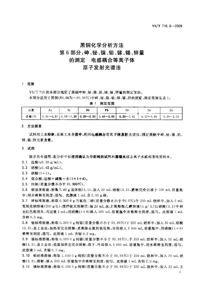 YS/T 716.6-2009 黑铜化学分析方法 第6部分:砷、铋、镍、铅、锑、锡、锌量的测定电感耦合等离子体原子发射光谱法