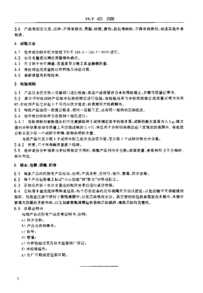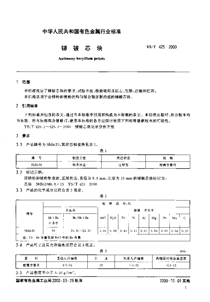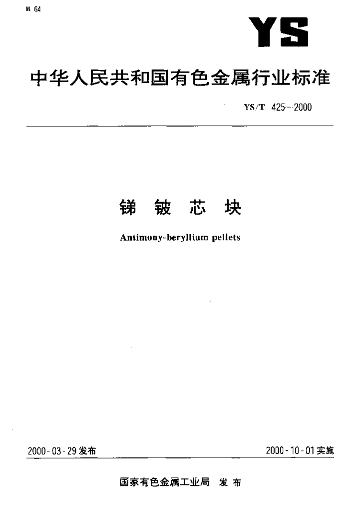 YS/T 425-2000 锑铍芯块