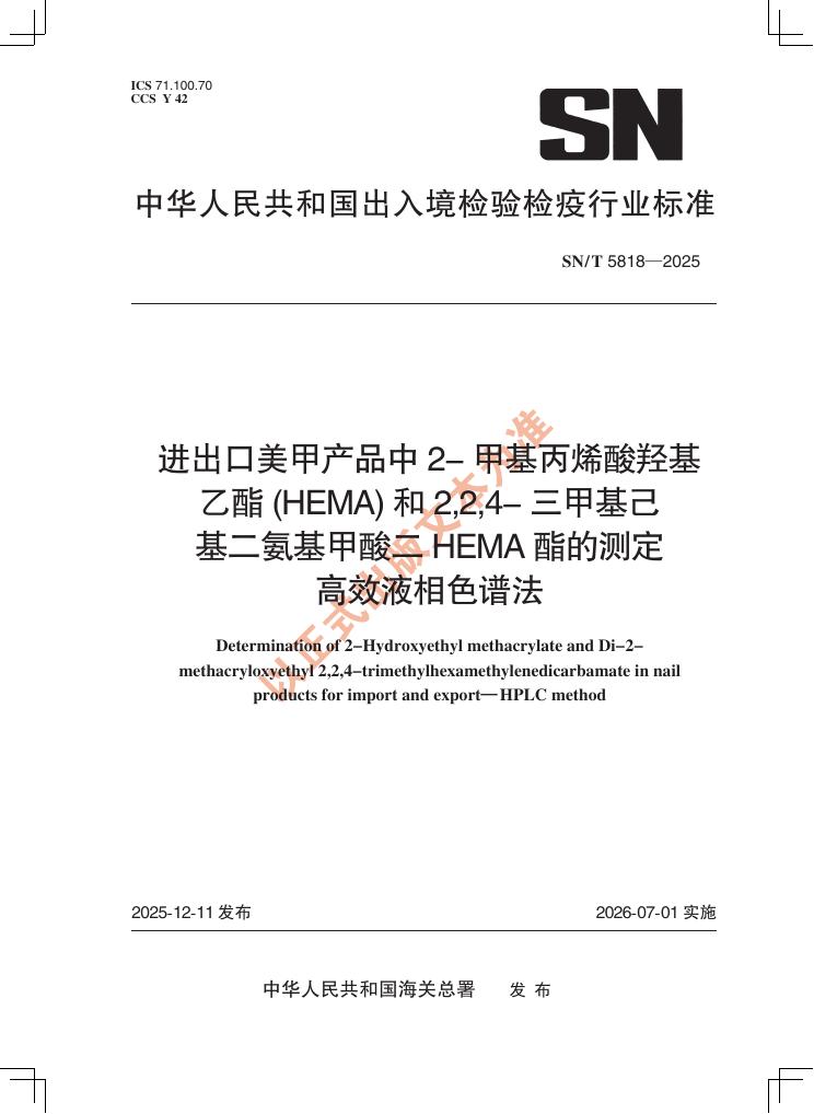 SN/T 5818-2025 进出口美甲产品中2-甲基丙烯酸羟基乙酯(HEMA)和2,2,4-三甲基己基二氨基甲酸二HEMA酯的测定 高效液相色谱法