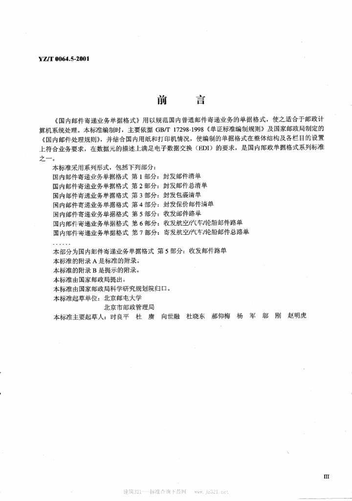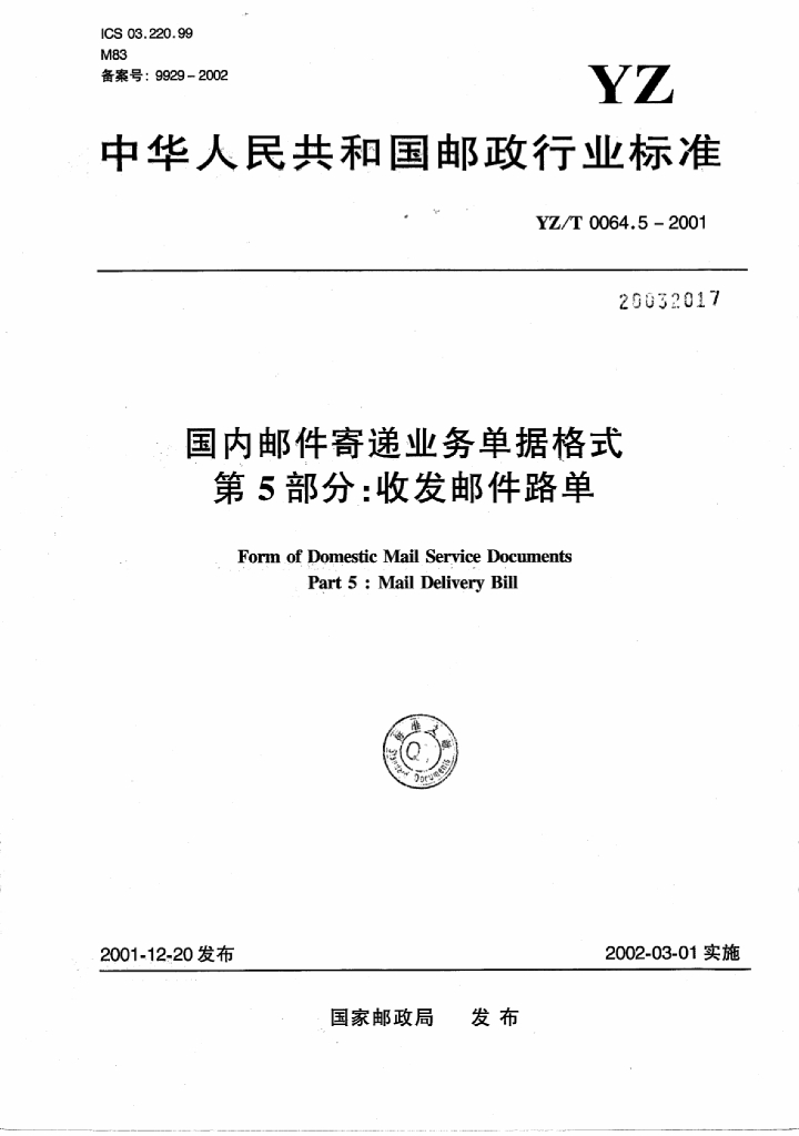 YZ/T 0064.5-2001 国内邮件寄递业务单据格式 第5部分:收发邮件路单