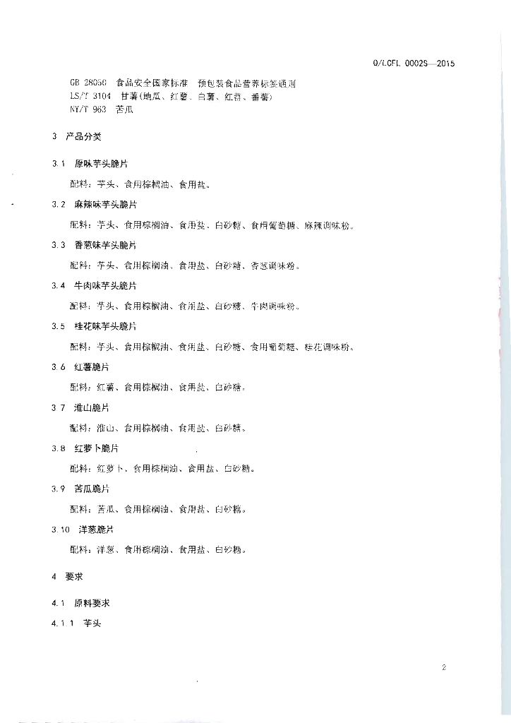 Q/LCFL 0002S-2015 桂林灵川县飞龙食品厂 薯蔬脆片制品