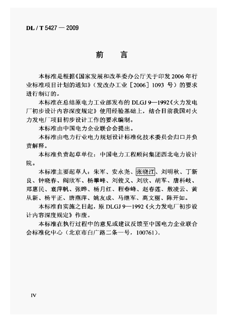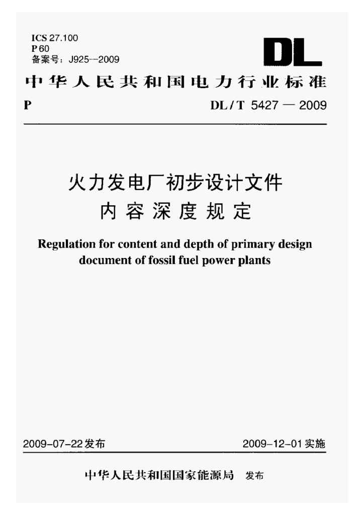DL/T 5427-2009 火力发电厂初步设计文件内容深度规定