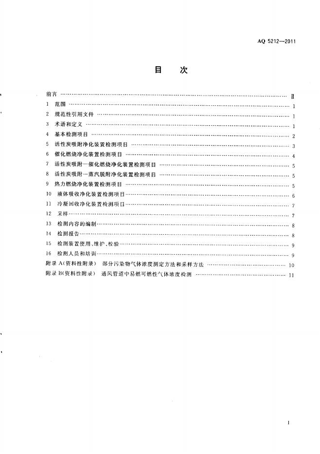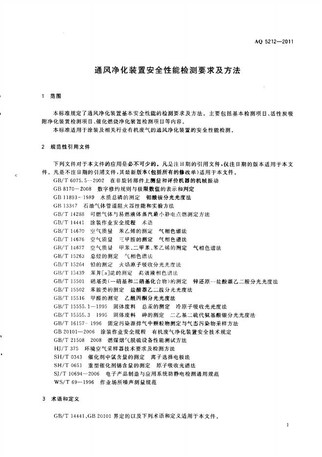 AQ/T 5212-2011 通风净化装置安全性能检测要求及方法