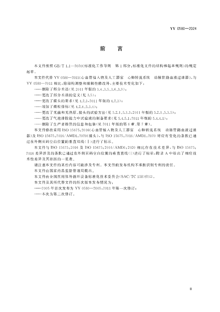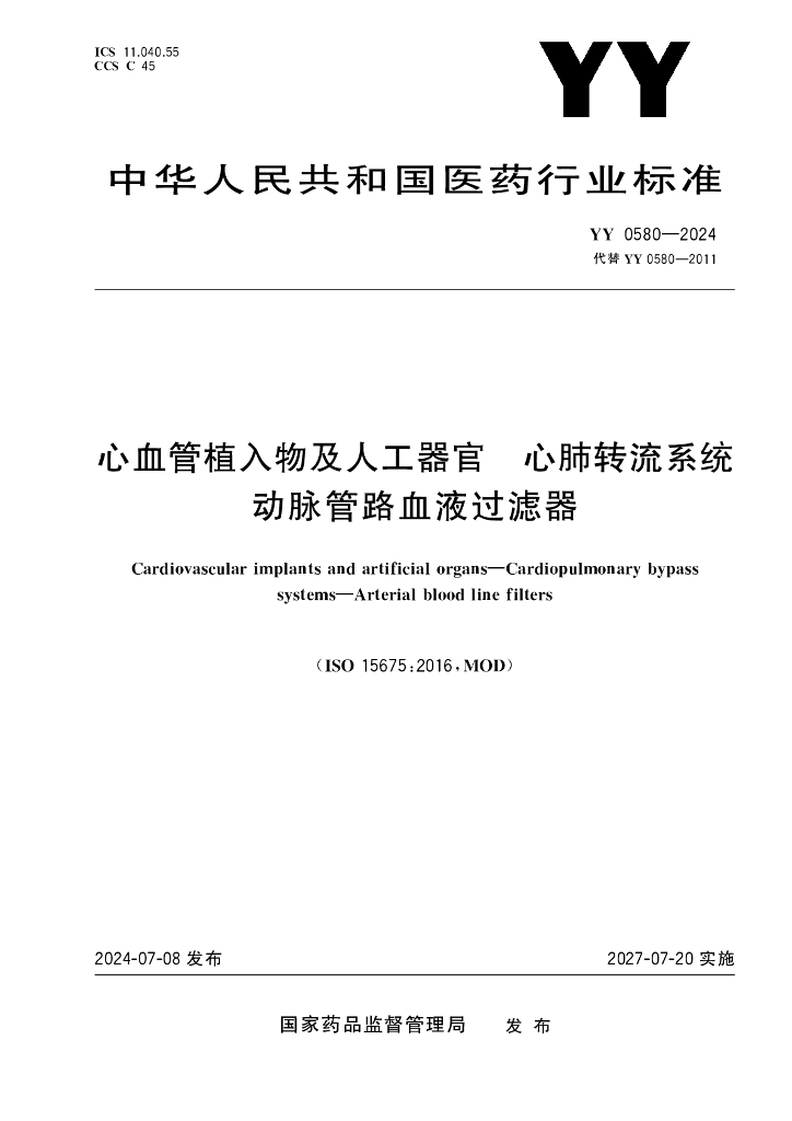 YY 0580-2024 心血管植入物及人工器官 心肺转流系统 动脉管路血液过滤器