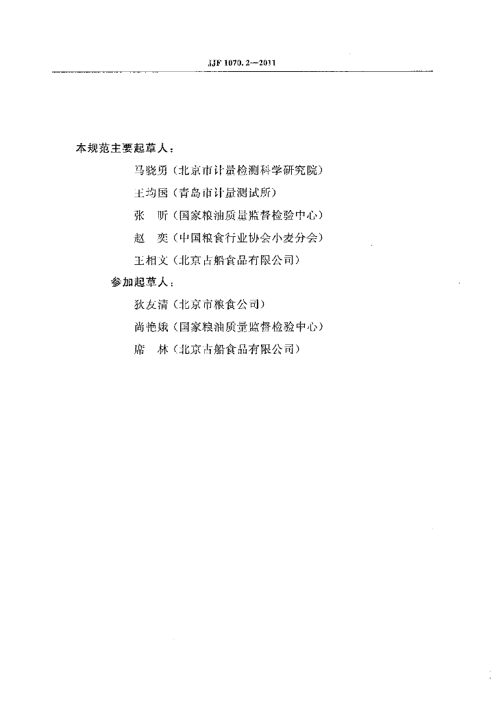 马晓勇(北京市计量检测科学研究院)、王均国(青岛市计量测试所)、张听(国家粮油质量监督检验中心)、赵奕(中国粮食行业协会小麦分会)、王相文(北京古船食品有限公司)、狄友清(北京市粮食公司)、尚艳娥(国家粮油质量监督检验中心)、席林(北京古船食品有限公司)