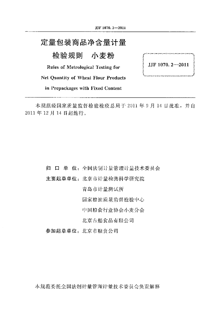 北京市计量检测科学研究院、青岛市计量测试所、国家粮油质量监督检验中心、中国粮食行业协会小麦分会、北京古船食品有限公司、北京市粮食公司