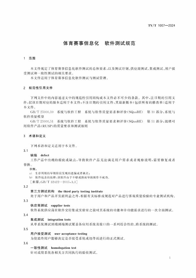 TY/T 1007-2024 体育赛事信息化 软件测试规范