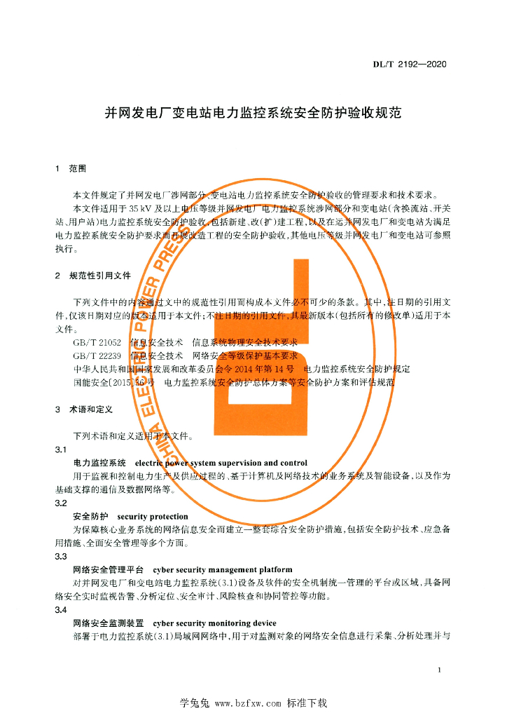 DL/T 2192-2020 并网发电厂变电站电力监控系统安全防护验收规范