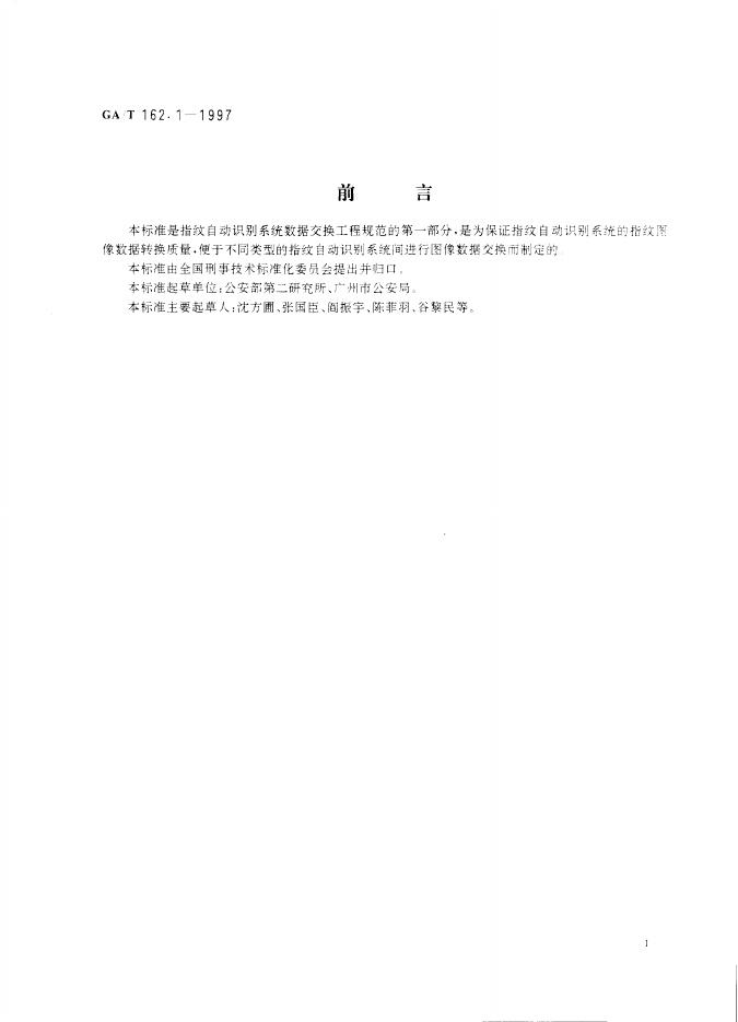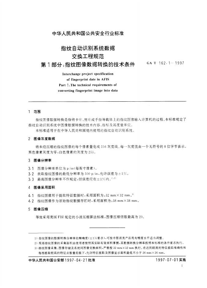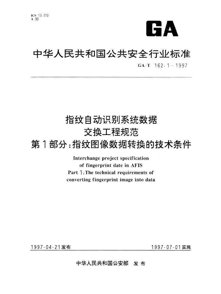 GA/T 162.1-1997 指纹自动识别系统数据交换工程规范 第1部分:指纹图象数据转换技术条件