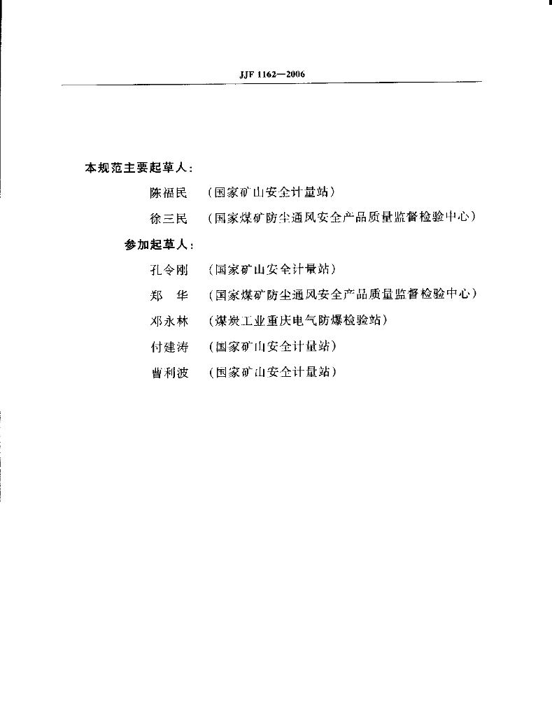 陈福民(国家矿山安全计量站)、徐三民(国家煤矿防尘通风安全产品质量监督检验中心)、孔令刚(国家矿山安全计量站)、郑华(国家煤矿防尘通风安全产品质量监督检验中心)、邓永林(煤炭工业重庆电气防爆检验站)、付建涛(国家矿山安全计量站)、曹利波(国家矿山安全计量站)