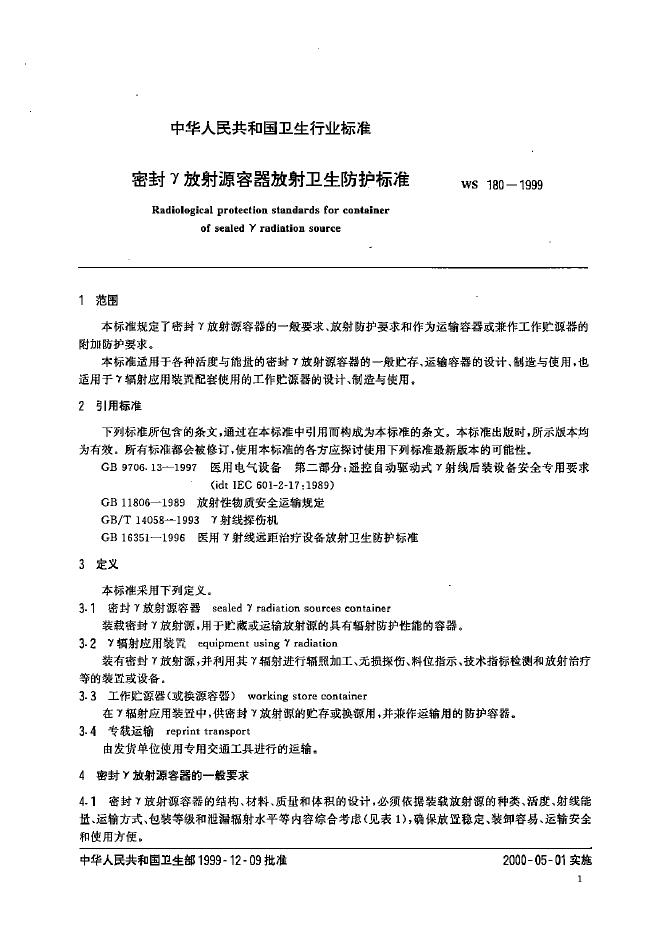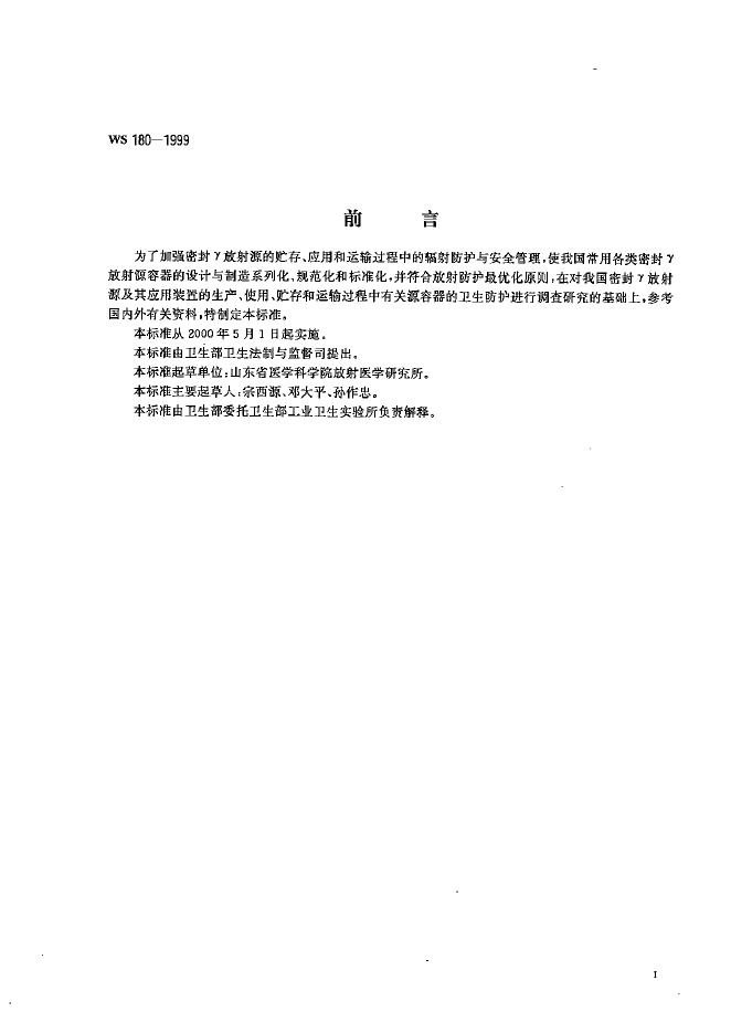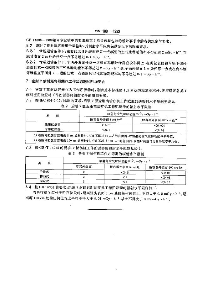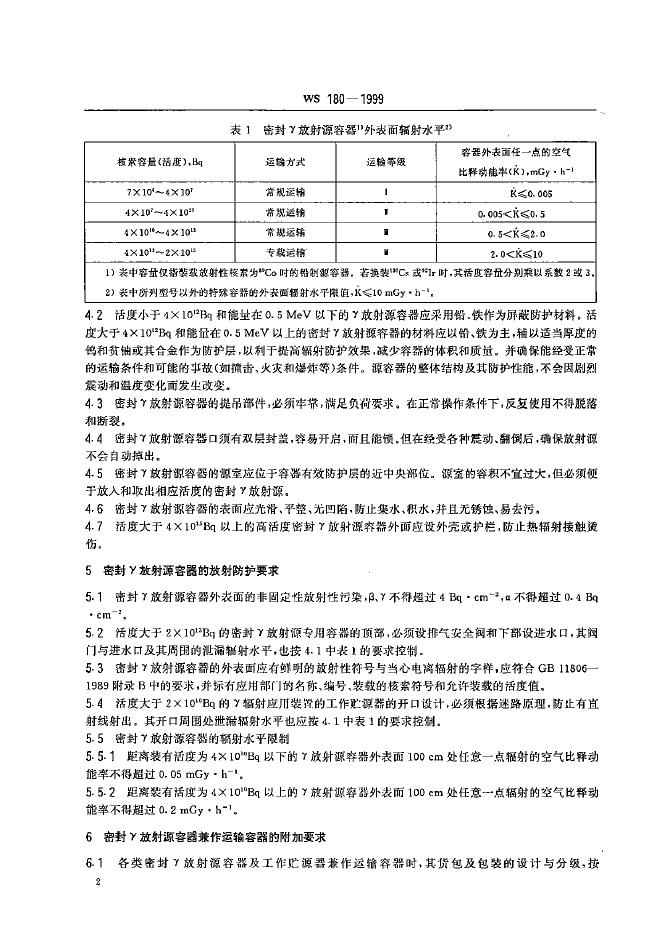 WS 180-1999 密封γ放射源容器放射卫生防护标准