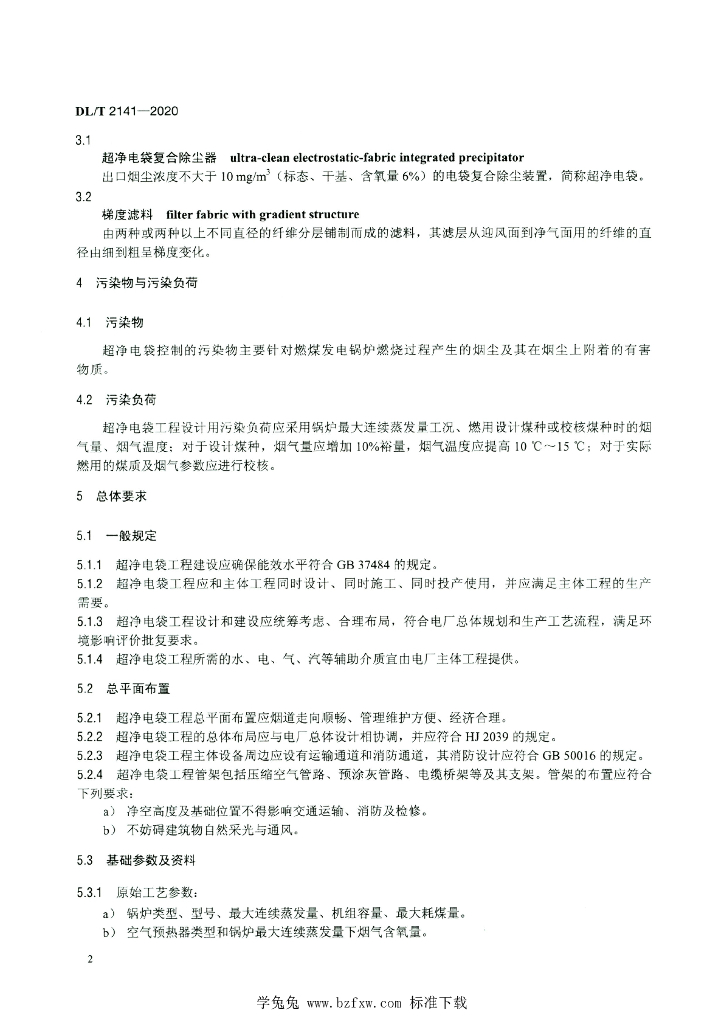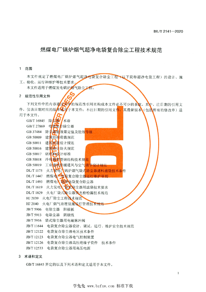 DL/T 2141-2020 燃煤电厂锅炉烟气超净电袋复合除尘工程技术规范